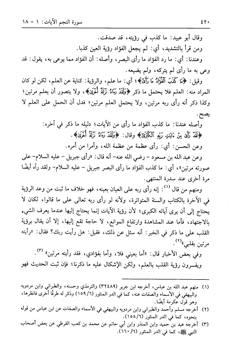 وقيل: (مَا كَذَبَ الْفُؤَادُ مَا رَأَى)؛ أي: ما علم، والرؤية: كناية عن العلم، لكن لو كان المراد منه: العلم فلا يحتمل ما ذكر (وَلَقَدْ رَآهُ نَزْلَةً أُخْرَى)، ولا يتصور أن يعلم مرتين؛ وكذا ذكر أنه رأى ربه مرتين، ولا يحتمل العلم مرتين؛ فدل أن الحمل على العلم لا يصح.