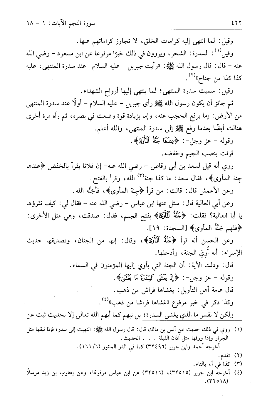 وقيل: السدرة: الشجر، ويروون في ذلك خبرًا مرفوعا عن ابن مسعود - رضي الله عنه - قال: قال رسول اللَّه - صَلَّى اللَّهُ عَلَيهِ وَسَلَّمَ -: " رأيت جبريل - عليه السلام - عند سدرة المنتهى، عليه كذا كذا من جناح ".