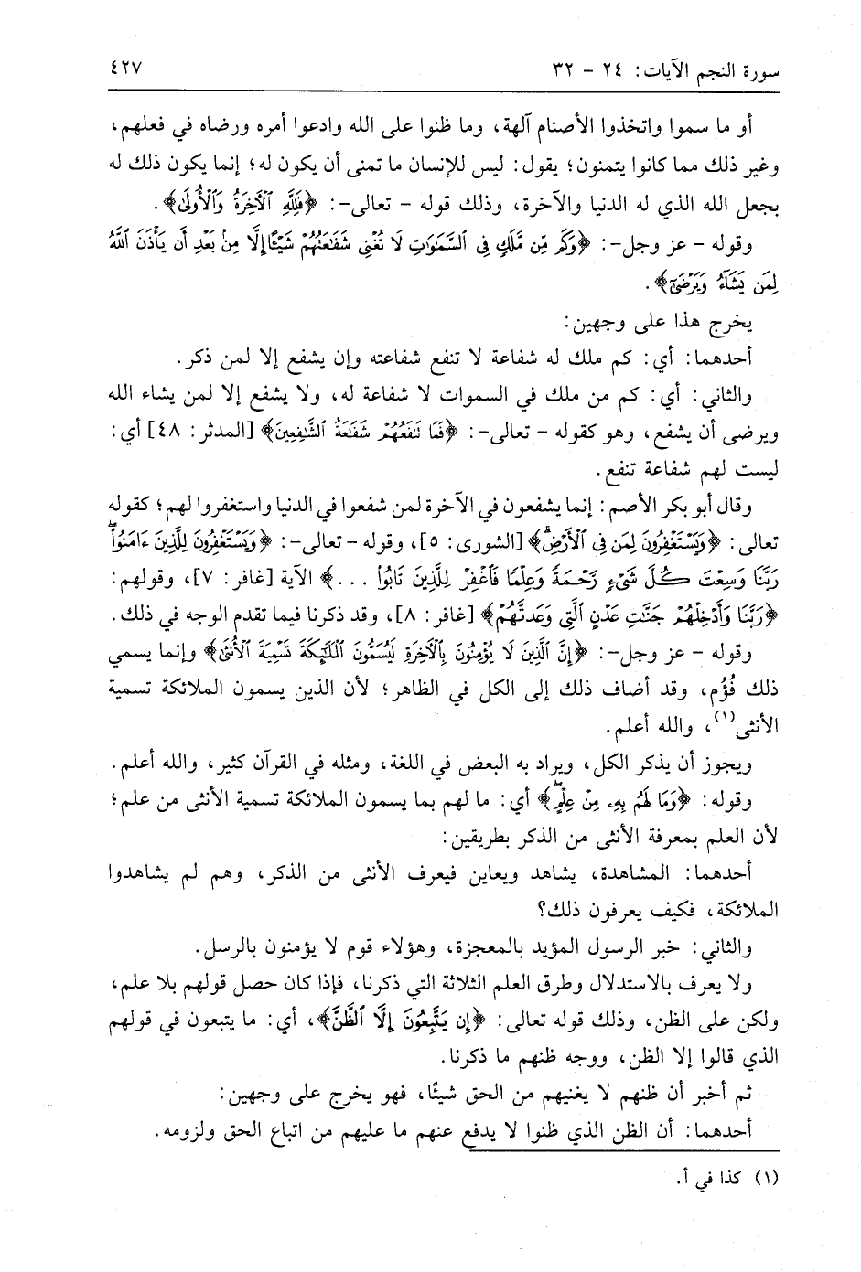 وقوله - عَزَّ وَجَلَّ -: (إِنَّ الَّذِينَ لَا يُؤْمِنُونَ بِالْآخِرَةِ لَيُسَمُّونَ الْمَلَائِكَةَ تَسْمِيَةَ الْأُنْثَى (27) وإنما يسمي ذلك فُؤُم، وقد أضاف ذلك إلى الكل في الظاهر؛ لأن الذين يسمون الملائكة تسمية الأنثى، واللَّه أعلم.