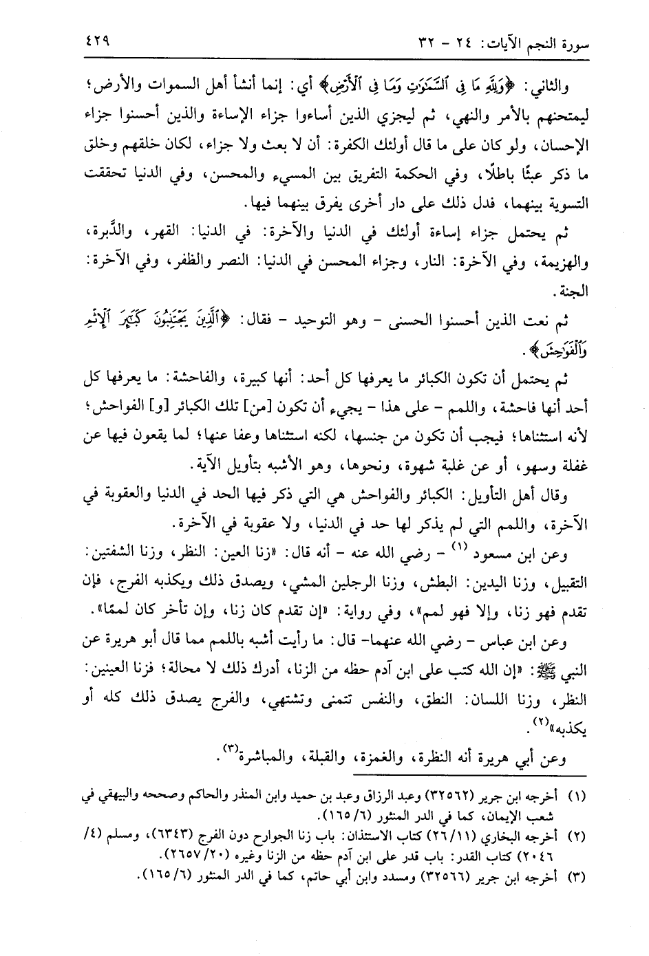 ثم نعت الذين أحسنوا الحسنى - وهو التوحيد - فقال: (الَّذِينَ يَجْتَنِبُونَ كَبَائِرَ الْإِثْمِ وَالْفَوَاحِشَ إِلَّا اللَّمَمَ إِنَّ رَبَّكَ وَاسِعُ الْمَغْفِرَةِ هُوَ أَعْلَمُ بِكُمْ إِذْ أَنْشَأَكُمْ مِنَ الْأَرْضِ وَإِذْ أَنْتُمْ أَجِنَّةٌ فِي بُطُونِ أُمَّهَاتِكُمْ فَلَا تُزَكُّوا أَنْفُسَكُمْ هُوَ أَعْلَمُ بِمَنِ اتَّقَى (32).