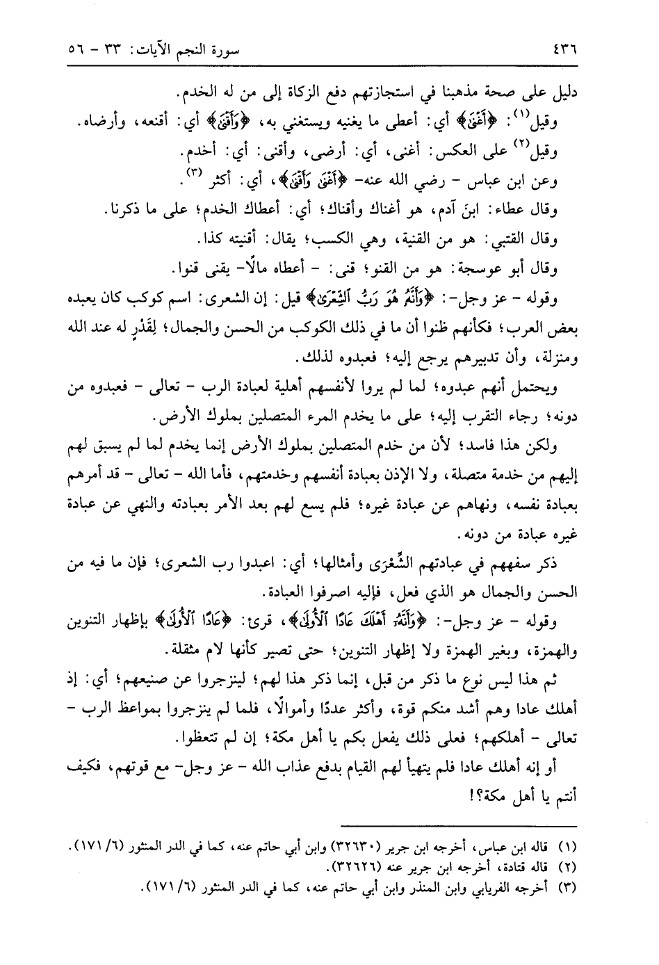 وقوله - عَزَّ وَجَلَّ -: (وَأَنَّهُ هُوَ رَبُّ الشِّعْرَى (49) قيل: إن الشعرى: اسم كوكب كان يعبده بعض العرب؛ فكأنهم ظنوا أن ما في ذلك الكوكب من الحسن والجمال؛ لِقَدْرٍ له عند الله ومنزلة، وأن تدبيرهم يرجع إليه؛ فعبدوه لذلك.