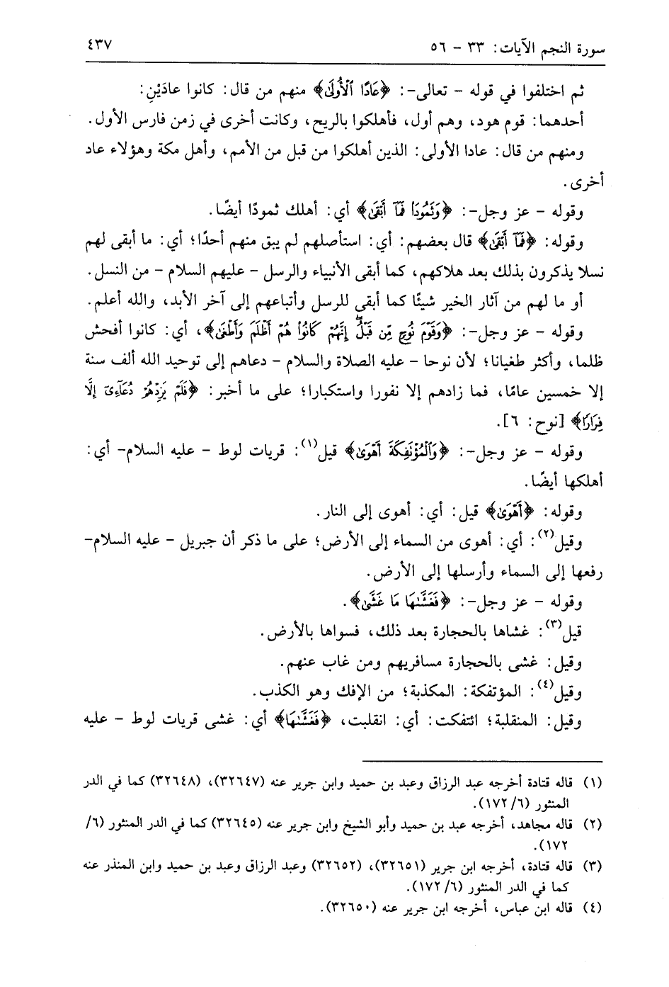 وقوله - عَزَّ وَجَلَّ -: (وَالْمُؤْتَفِكَةَ أَهْوَى (53) قيل: قريات لوط - عليه السلام - أي: أهلكها أيضًا.