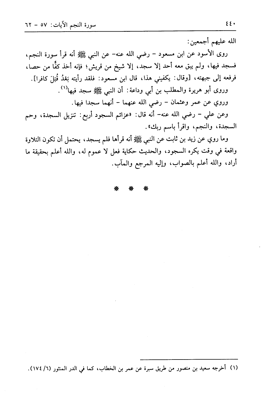 روى الأسود عن ابن مسعود - رَضِيَ اللَّهُ عَنْهُ - عن النبي - صَلَّى اللَّهُ عَلَيهِ وَسَلَّمَ - أنه قرأ سورة النجم، فسجد فيها، ولم يبق معه أحد إلا سجد، إلا شيخ من قريش؛ فإنه أخذ كفًّا من حصا، فرفعه إلى جبهته، وقال: يكفيني هذا، قال ابن مسعود: فلقد رأيته بَعْدُ قُتِلَ كافرًا.