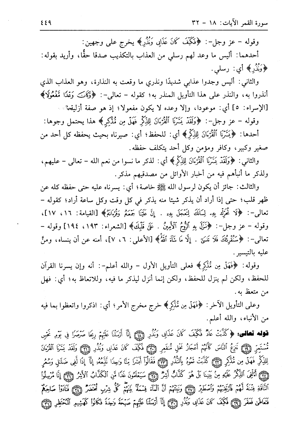 قوله تعالى: (كَذَّبَتْ عَادٌ فَكَيْفَ كَانَ عَذَابِي وَنُذُرِ (18) إِنَّا أَرْسَلْنَا عَلَيْهِمْ رِيحًا صَرْصَرًا فِي يَوْمِ نَحْسٍ مُسْتَمِرٍّ (19) تَنْزِعُ النَّاسَ كَأَنَّهُمْ أَعْجَازُ نَخْلٍ مُنْقَعِرٍ (20) فَكَيْفَ كَانَ عَذَابِي وَنُذُرِ (21) وَلَقَدْ يَسَّرْنَا الْقُرْآنَ لِلذِّكْرِ فَهَلْ مِنْ مُدَّكِرٍ (22) كَذَّبَتْ ثَمُودُ بِالنُّذُرِ (23) فَقَالُوا أَبَشَرًا مِنَّا وَاحِدًا نَتَّبِعُهُ إِنَّا إِذًا لَفِي ضَلَالٍ وَسُعُرٍ (24) أَأُلْقِيَ الذِّكْرُ عَلَيْهِ مِنْ بَيْنِنَا بَلْ هُوَ كَذَّابٌ أَشِرٌ (25) سَيَعْلَمُونَ غَدًا مَنِ الْكَذَّابُ الْأَشِرُ (26) إِنَّا مُرْسِلُو النَّاقَةِ فِتْنَةً لَهُمْ فَارْتَقِبْهُمْ وَاصْطَبِرْ (27) وَنَبِّئْهُمْ أَنَّ الْمَاءَ قِسْمَةٌ بَيْنَهُمْ كُلُّ شِرْبٍ مُحْتَضَرٌ (28) فَنَادَوْا صَاحِبَهُمْ فَتَعَاطَى فَعَقَرَ (29) فَكَيْفَ كَانَ عَذَابِي وَنُذُرِ (30) إِنَّا أَرْسَلْنَا عَلَيْهِمْ صَيْحَةً وَاحِدَةً فَكَانُوا كَهَشِيمِ الْمُحْتَظِرِ (31)