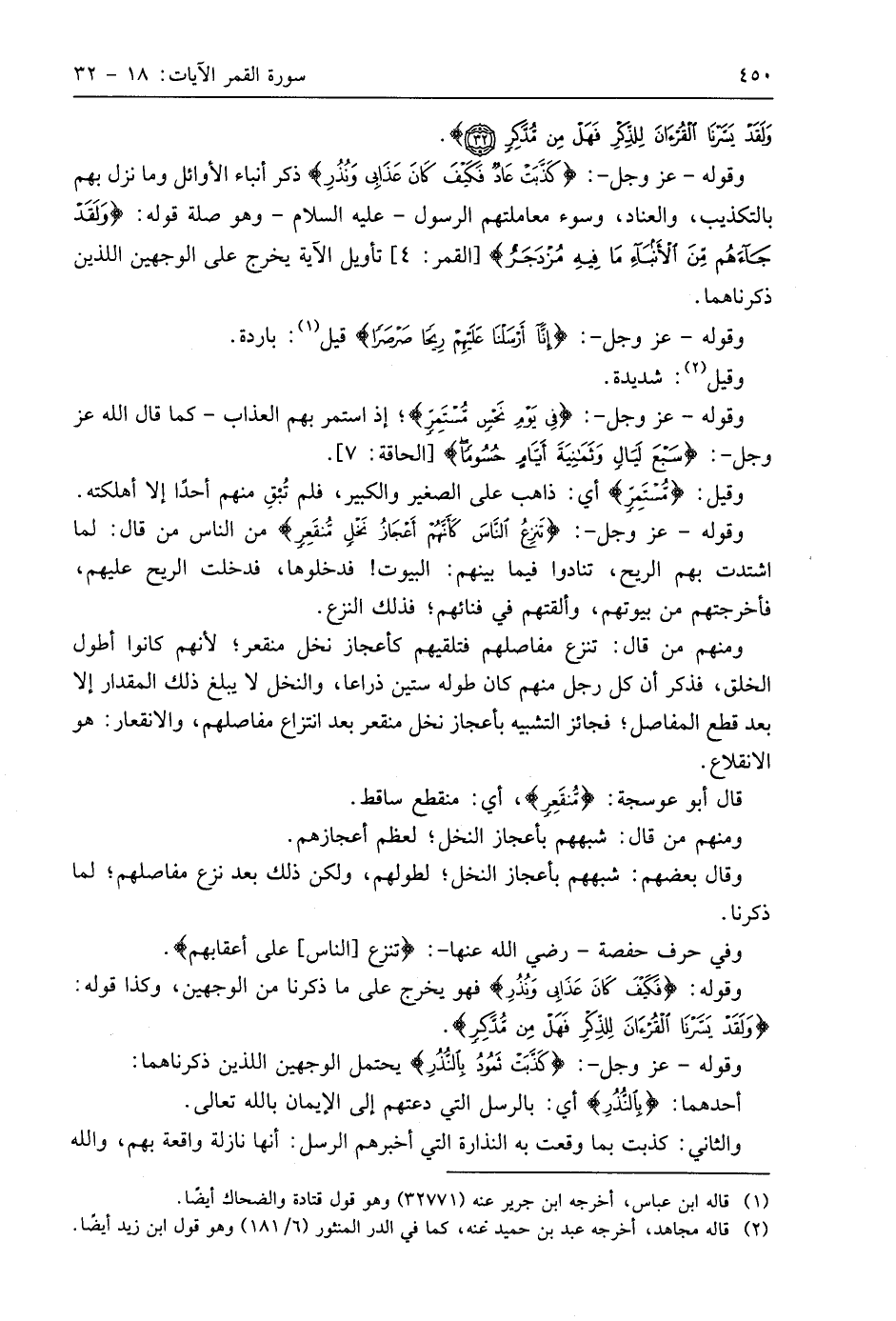 وقوله - عَزَّ وَجَلَّ -: (كَذَّبَتْ عَادٌ فَكَيْفَ كَانَ عَذَابِي وَنُذُرِ (18) ذكر أنباء الأوائل وما نزل بهم بالتكذيب، والعناد، وسوء معاملتهم الرسول - عليه السلام - وهو صلة قوله: (وَلَقَدْ جَاءَهُمْ مِنَ الْأَنْبَاءِ مَا فِيهِ مُزْدَجَرٌ)، تأويل الآية يخرج على الوجهين اللذين ذكرناهما.