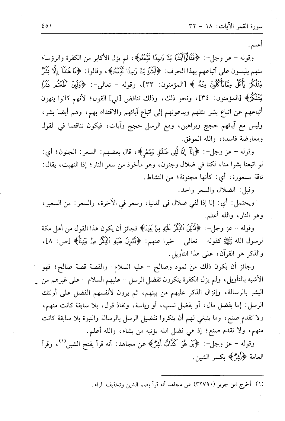 وقوله - عَزَّ وَجَلَّ -: (فَقَالُوا أَبَشَرًا مِنَّا وَاحِدًا نَتَّبِعُهُ إِنَّا إِذًا لَفِي ضَلَالٍ وَسُعُرٍ (24) لم يزل الأكابر من الكفرة والرؤساء منهم يلبسون على أتباعهم بهذا الحرف: (أَبَشَرًا مِنَّا وَاحِدًا نَتَّبِعُهُ)، وقالوا: (مَا هَذَا إِلَّا بَشَرٌ مِثْلُكُمْ يَأْكُلُ مِمَّا تَأْكُلُونَ مِنْهُ)، وقوله - تعالى -: (وَلَئِنْ أَطَعْتُمْ بَشَرًا مِثْلَكُمْ)، ونحو ذلك، وذلك تناقض في القول؛ لأنهم كانوا ينهون أتباعهم عن اتباع بشر مثلهم ويدعونهم إلى اتباع آبائهم والاقتداء بهم، وهم أيضا بشر، وليس مع آبائهم حجج وبراهين، ومع الرسل حجج وآيات، فيكون تناقضا في القول ومعارضة فاسدة، واللَّه الموفق.