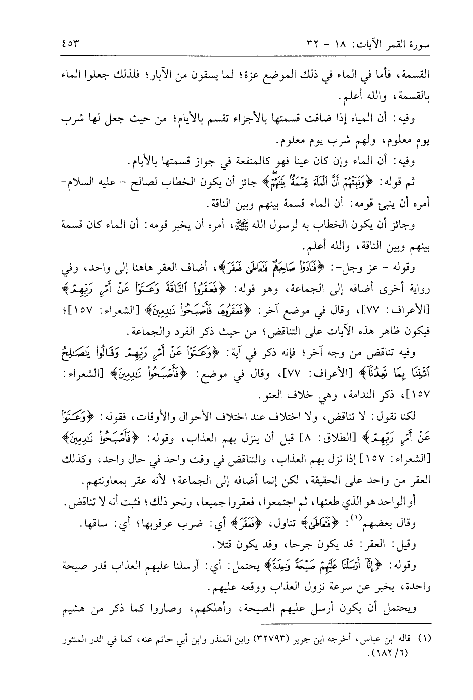 وقوله - عَزَّ وَجَلَّ -: (فَنَادَوْا صَاحِبَهُمْ فَتَعَاطَى فَعَقَرَ (29) أضاف العقر هاهنا إلى واحد، وفي رواية أخرى أضافه إلى الجماعة، وهو قوله: (فَعَقَرُوا النَّاقَةَ وَعَتَوْا عَنْ أَمْرِ رَبِّهِمْ)، وقال في موضع آخر: (فَعَقَرُوهَا فَأَصْبَحُوا نَادِمِينَ)؛ فيكون ظاهر هذه الآيات على التناقض؛ من حيث ذكر الفرد والجماعة.