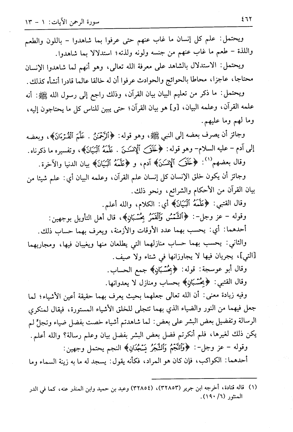وجائز أن يصرف بعضه إلى النبي - صَلَّى اللَّهُ عَلَيهِ وَسَلَّمَ -، وهو قوله: (الرَّحْمَنُ. عَلَّمَ الْقُرْآنَ)، وبعضه إلى آدم - عليه السلام - وهو قوله: (خَلَقَ الْإِنْسَانَ. عَلَّمَهُ الْبَيَانَ)، وتفسيره ما ذكرناه.
