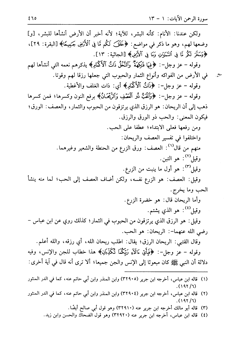 وقوله - عَزَّ وَجَلَّ -: (وَالْحَبُّ ذُو الْعَصْفِ وَالرَّيْحَانُ (12) برفع النون وكسرها؛ فمن كسرها ذهب إلى أن الريحان: هو الرزق الذي يرتزقون من الحبوب والثمار، والعصف: الورق؛ فيكون المعنى: والحب ذو الورق والرزق.