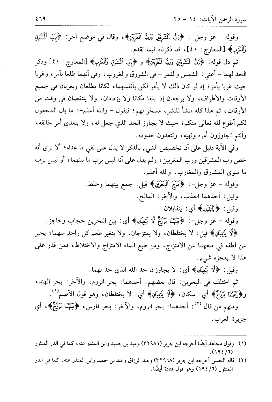 ثم اختلف في البحرين: قَالَ بَعْضُهُمْ: أحدهما: بحر الروم، والآخر: بحر الهند، و (بَيْنَهُمَا بَرْزَخٌ) أي: سكان، (لَا يَبْغِيَانِ) أي: لا يختلطان، وهو قول الأصم.
