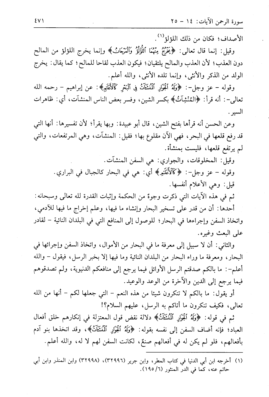 ثم في قوله: (وَلَهُ الْجَوَارِ الْمُنْشَئَاتُ) دلالة نقض قول المعتزلة في إنكارهم خلق أفعال العباد؛ فإنه أضاف السفن إلى نفسه بقوله: (وَلَهُ الْجَوَارِ الْمُنْشَئَاتُ)، وقد اتخذها بنو آدم بأفعالهم، فلو لم يكن له في أفعالهم صنعٌ، لكانت السفن لهم لا له، واللَّه أعلم.