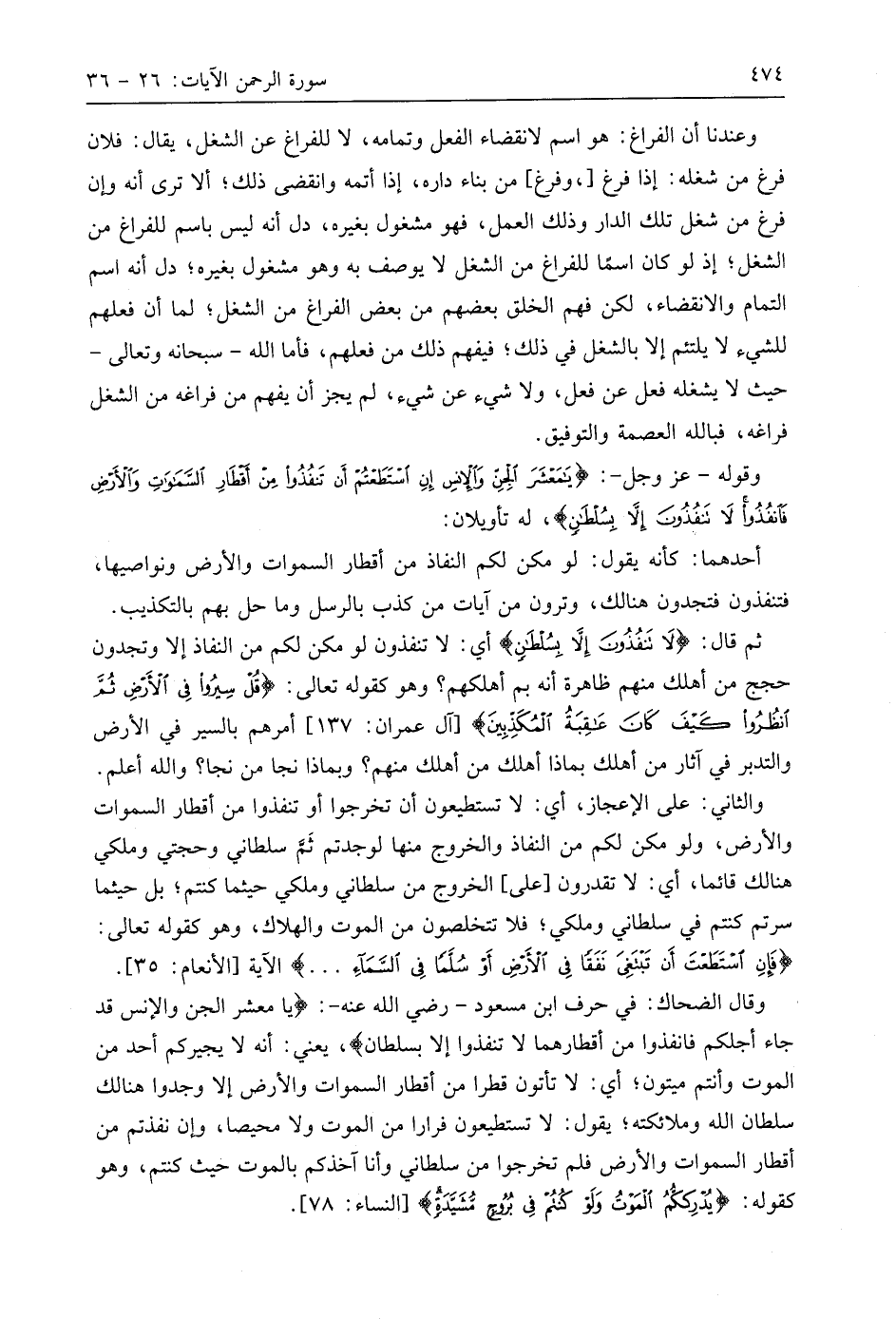 وقال الضحاك: في حرف ابن مسعود - رَضِيَ اللَّهُ عَنْهُ -: (يا معشر الجن والإنس قد جاء أجلكم فانفذوا من أقطارهما لا تنفذوا إلا بسلطان)، يعني: أنه لا يجيركم أحد من الموت وأنتم ميتون؛ أي: لا تأتون قطرا من أقطار السماوات والأرض إلا وجدوا هنالك سلطان اللَّه وملائكته؛ يقول: لا تستطيعون فرارا من الموت ولا محيصا، وإن نفذتم من أقطار السماوات والأرض فلم تخرجوا من سلطاني وأنا آخذكم بالموت حيث كنتم، وهو كقوله: (يُدْرِكْكُمُ الْمَوْتُ وَلَوْ كُنْتُمْ فِي بُرُوجٍ مُشَيَّدَةٍ).