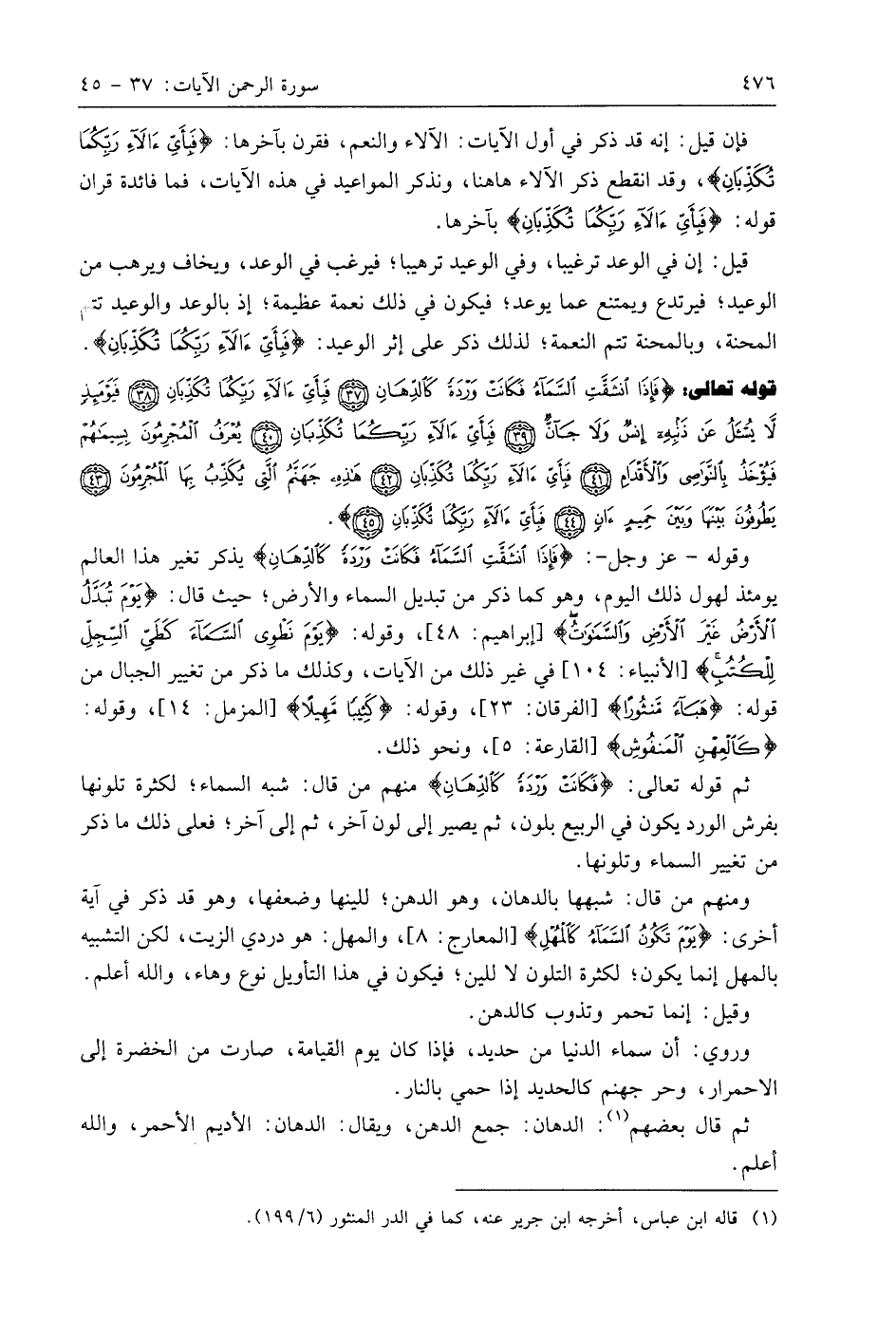 قوله تعالى: (فَإِذَا انْشَقَّتِ السَّمَاءُ فَكَانَتْ وَرْدَةً كَالدِّهَانِ (37) فَبِأَيِّ آلَاءِ رَبِّكُمَا تُكَذِّبَانِ (38) فَيَوْمَئِذٍ لَا يُسْأَلُ عَنْ ذَنْبِهِ إِنْسٌ وَلَا جَانٌّ (39) فَبِأَيِّ آلَاءِ رَبِّكُمَا تُكَذِّبَانِ (40) يُعْرَفُ الْمُجْرِمُونَ بِسِيمَاهُمْ فَيُؤْخَذُ بِالنَّوَاصِي وَالْأَقْدَامِ (41) فَبِأَيِّ آلَاءِ رَبِّكُمَا تُكَذِّبَانِ (42) هَذِهِ جَهَنَّمُ الَّتِي يُكَذِّبُ بِهَا الْمُجْرِمُونَ (43) يَطُوفُونَ بَيْنَهَا وَبَيْنَ حَمِيمٍءَانٍ (44) فَبِأَيِّ آلَاءِ رَبِّكُمَا تُكَذِّبَانِ (45).