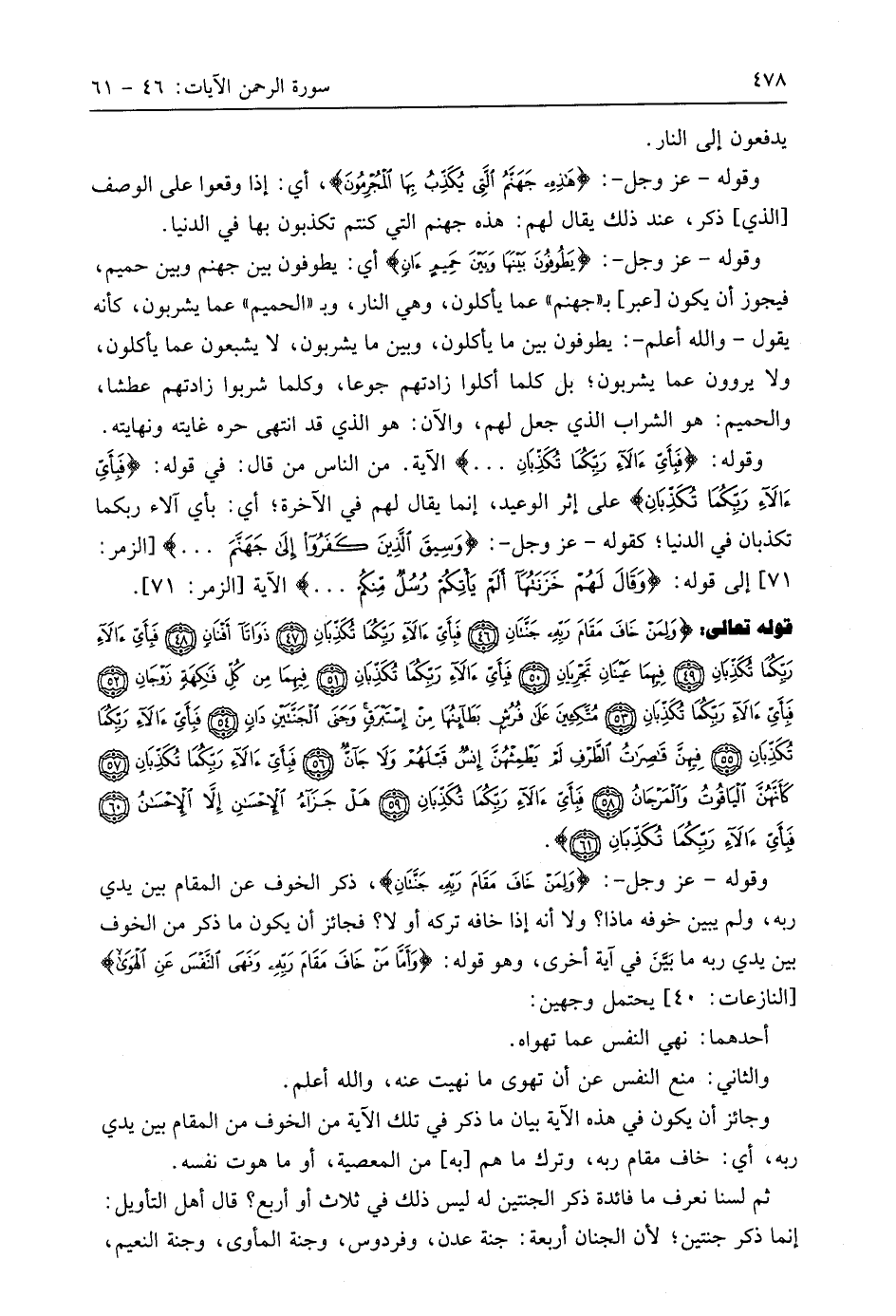 قوله تعالى: (وَلِمَنْ خَافَ مَقَامَ رَبِّهِ جَنَّتَانِ (46) فَبِأَيِّ آلَاءِ رَبِّكُمَا تُكَذِّبَانِ (47) ذَوَاتَا أَفْنَانٍ (48) فَبِأَيِّ آلَاءِ رَبِّكُمَا تُكَذِّبَانِ (49) فِيهِمَا عَيْنَانِ تَجْرِيَانِ (50) فَبِأَيِّ آلَاءِ رَبِّكُمَا تُكَذِّبَانِ (51) فِيهِمَا مِنْ كُلِّ فَاكِهَةٍ زَوْجَانِ (52) فَبِأَيِّ آلَاءِ رَبِّكُمَا تُكَذِّبَانِ (53) مُتَّكِئِينَ عَلَى فُرُشٍ بَطَائِنُهَا مِنْ إِسْتَبْرَقٍ وَجَنَى الْجَنَّتَيْنِ دَانٍ (54) فَبِأَيِّ آلَاءِ رَبِّكُمَا تُكَذِّبَانِ (55) فِيهِنَّ قَاصِرَاتُ الطَّرْفِ لَمْ يَطْمِثْهُنَّ إِنْسٌ قَبْلَهُمْ وَلَا جَانٌّ (56) فَبِأَيِّ آلَاءِ رَبِّكُمَا تُكَذِّبَانِ (57) كَأَنَّهُنَّ الْيَاقُوتُ وَالْمَرْجَانُ (58) فَبِأَيِّ آلَاءِ رَبِّكُمَا تُكَذِّبَانِ (59) هَلْ جَزَاءُ الْإِحْسَانِ إِلَّا الْإِحْسَانُ (60) فَبِأَيِّ آلَاءِ رَبِّكُمَا تُكَذِّبَانِ (61).