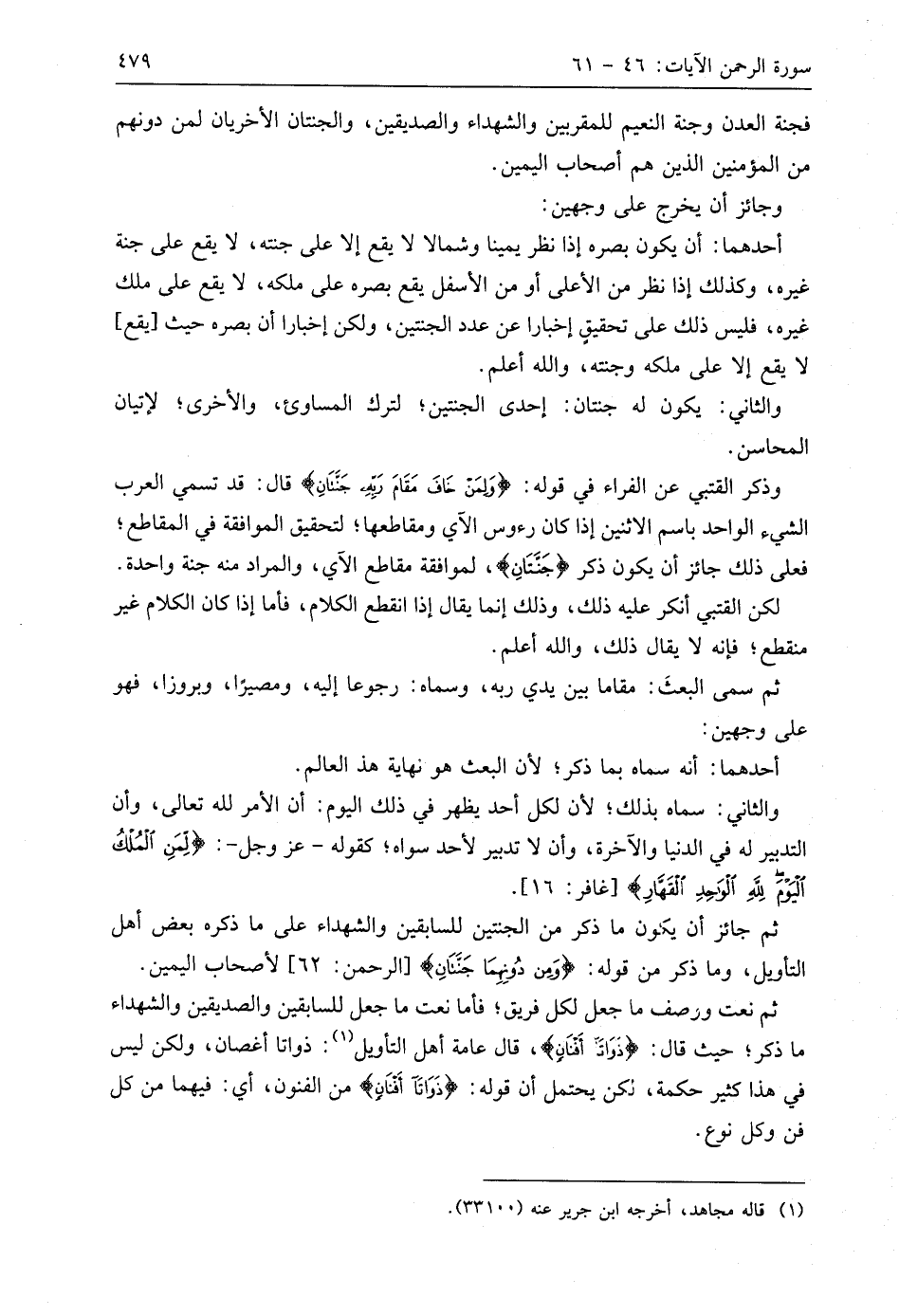 وذكر الْقُتَبِيّ عن الفراء في قوله: (وَلِمَنْ خَافَ مَقَامَ رَبِّهِ جَنَّتَانِ) قال: قد تسمي العرب الشيء الواحد باسم الاثنين إذا كان رءوس الآي ومقاطعها؛ لتحقيق الموافقة في المقاطع؛ فعلى ذلك جائز أن يكون ذكر (جَنَّتَانِ)، لموافقة مقاطع الآي، والمراد منه جنة واحدة.