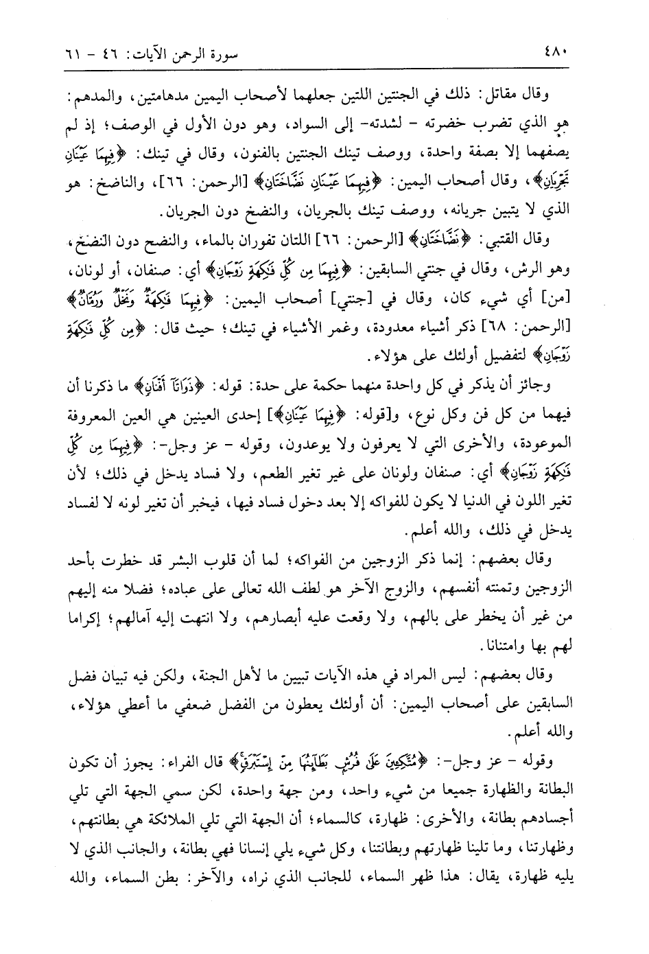 وقَالَ الْقُتَبِيُّ: (نَضَّاخَتَانِ)، اللتان تفوران بالماء، والنضح دون النضخ، وهو الرش، وقال في جنتي السابقين: (فِيهِمَا مِنْ كُلِّ فَاكِهَةٍ زَوْجَانِ (52) أي: صنفان، أو لونان، من أي شيء كان، وقال في جنتي أصحاب اليمين: (فِيهِمَا فَاكِهَةٌ وَنَخْلٌ وَرُمَّانٌ)، ذكر أشياء معدودة، وغمر الأشياء في تينك؛ حيث قال: (فِيهِمَا مِنْ كُلِّ فَاكِهَةٍ زَوْجَانِ) لتفضيل أُولَئِكَ على هَؤُلَاءِ.