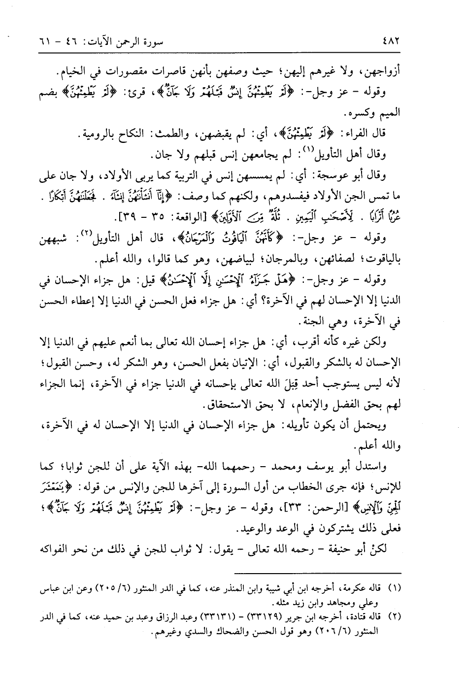 واستدل أبو يوسف ومُحَمَّد - رحمهما اللَّه - بهذه الآية على أن للجن ثوابا؛ كما للإنس؛ فإنه جرى الخطاب من أول السورة إلى آخرها للجن والإنس من قوله: (يَا مَعْشَرَ الْجِنِّ وَالْإِنْسِ)، وقوله - عَزَّ وَجَلَّ -: (لَمْ يَطْمِثْهُنَّ إِنْسٌ قَبْلَهُمْ وَلَا جَانٌّ)؛ فعلى ذلك يشتركون في الوعد والوعيد.