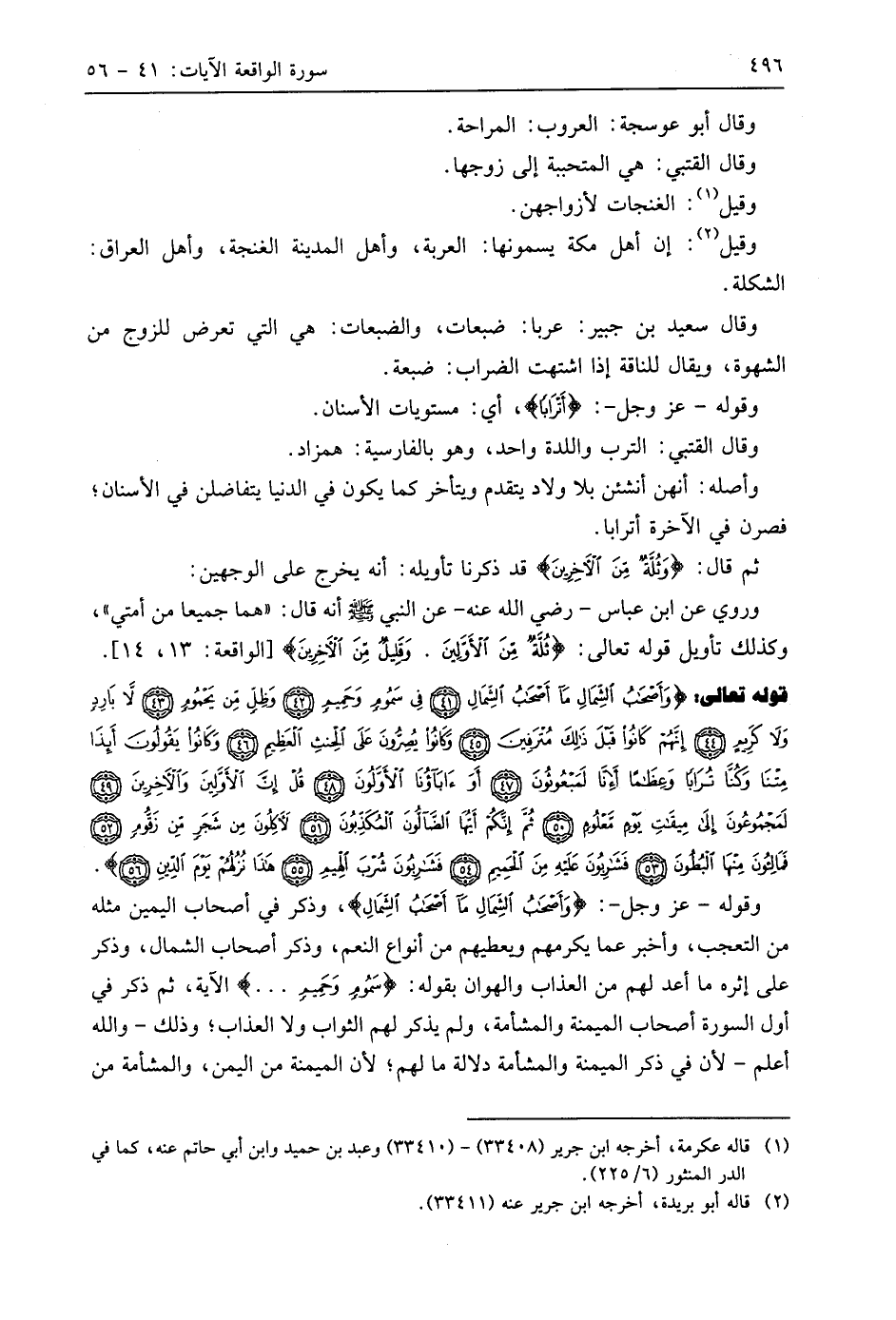 وروي عن ابن عَبَّاسٍ - رَضِيَ اللَّهُ عَنْهُ - عن النبي - صَلَّى اللَّهُ عَلَيهِ وَسَلَّمَ - أنه قال: " هما جميعا من أمتي "، وكذلك تأويل قوله تعالى: (ثُلَّةٌ مِنَ الْأَوَّلِينَ (13) وَقَلِيلٌ مِنَ الْآخِرِينَ).