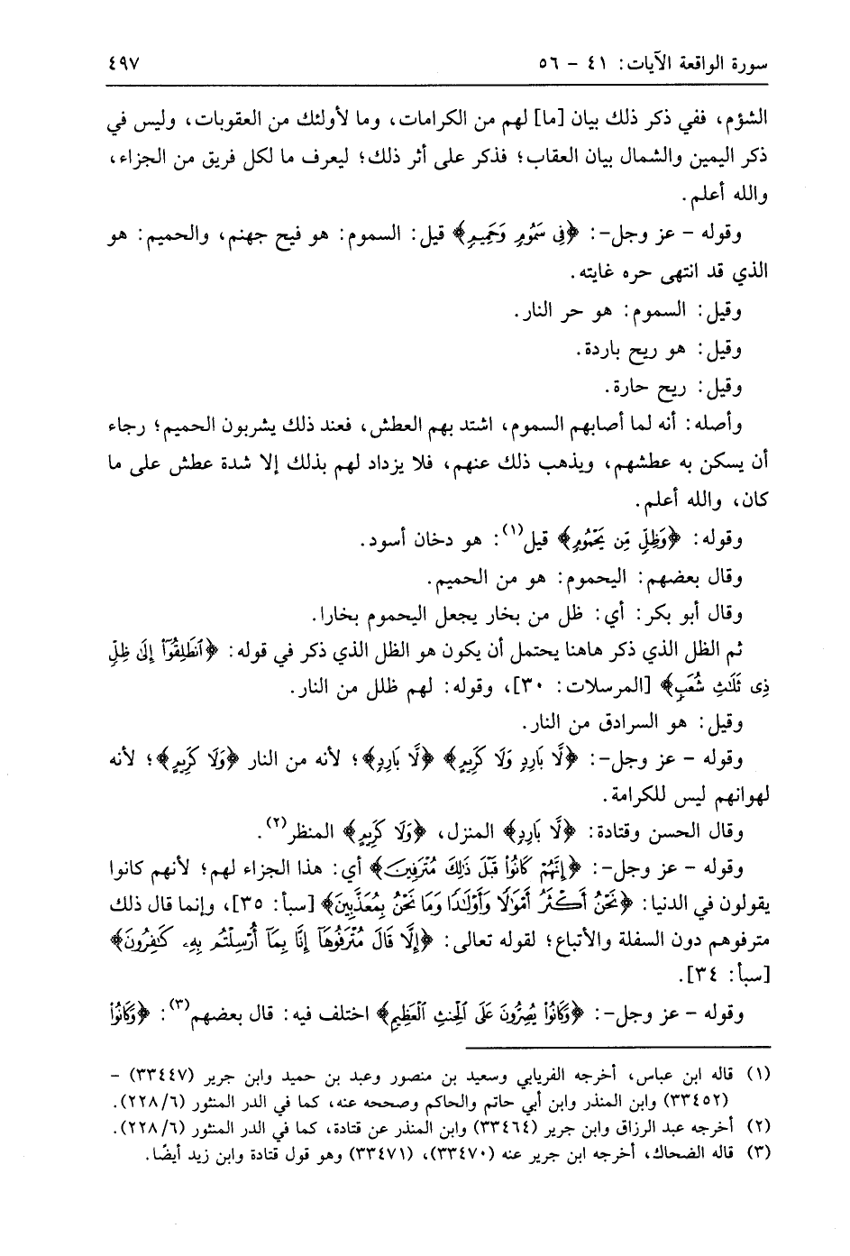 وقوله - عَزَّ وَجَلَّ -: (فِي سَمُومٍ وَحَمِيمٍ (42) قيل: السموم: هو فيح جهنم، والحميم: هو الذي قد انتهى حره غايته.