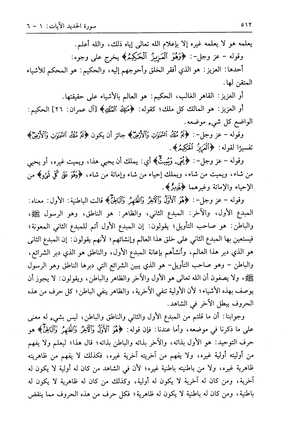 وجوابنا: أن ما قلتم من المبدع الأول والثاني والناطق والباطن، ليس بشيء له معنى على ما ذكرنا في موضعه، وأما عندنا: فإن قوله: (هُوَ الْأَوَّلُ وَالْآخِرُ وَالظَّاهِرُ وَالْبَاطِنُ) هو حرف التوحيد: هو الأول بذاته، والآخر بذاته والباطن بذاته؛ قال هذا؛ ليعلم ولا يفهم من أوليته أولية غيره، ولا يفهم من آخريته آخرية غيره، فكذلك لا يفهم من ظاهريته ظاهرية غيره، ولا من باطنيته باطنية غيره؛ لأن في الشاهد من كان له أولية لا يكون له آخرية، ومن كان له آخرية لا يكون له أولية، وكذلك من كان له ظاهرية لا يكون له باطنية، ومن كان له باطنية لا يكون له ظاهرية؛ فكل حرف من هذه الحروف مما ينقض