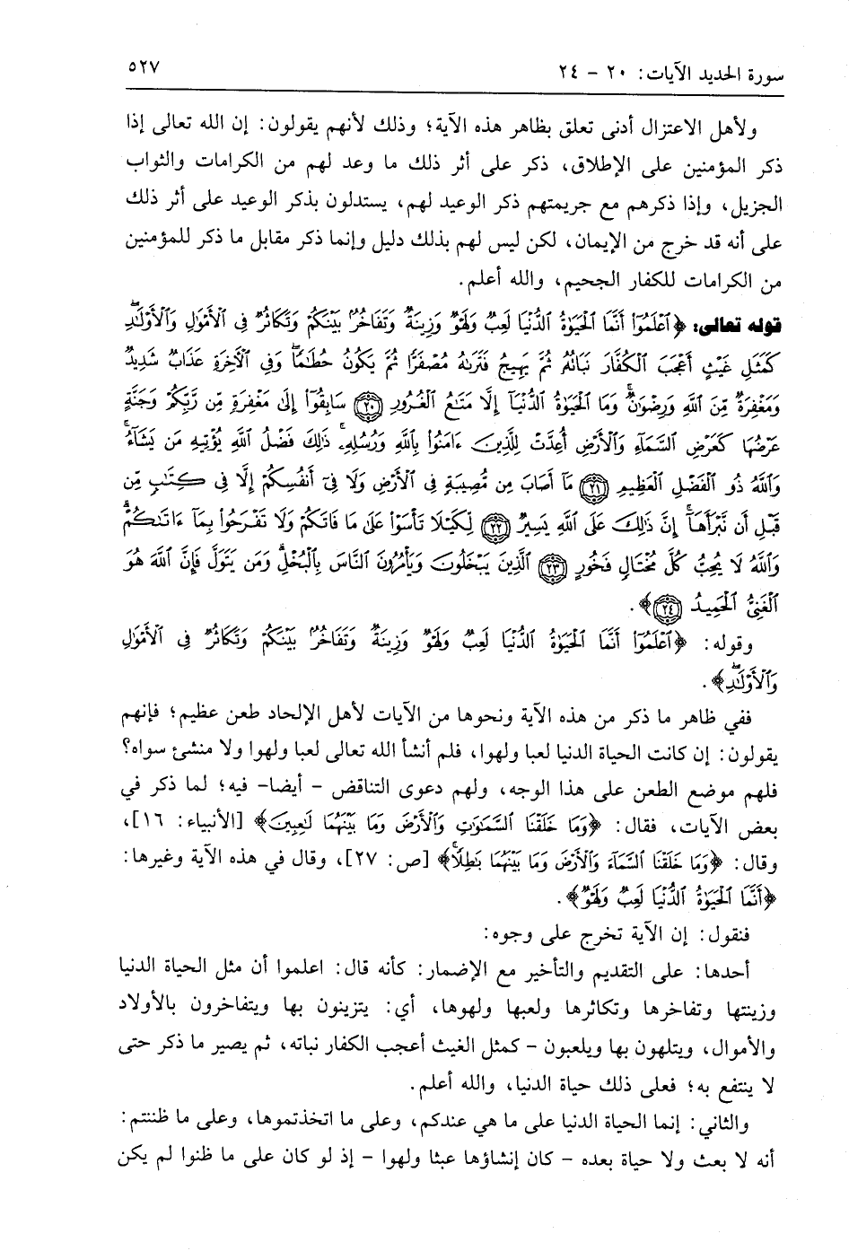 قوله تعالى: (اعْلَمُوا أَنَّمَا الْحَيَاةُ الدُّنْيَا لَعِبٌ وَلَهْوٌ وَزِينَةٌ وَتَفَاخُرٌ بَيْنَكُمْ وَتَكَاثُرٌ فِي الْأَمْوَالِ وَالْأَوْلَادِ كَمَثَلِ غَيْثٍ أَعْجَبَ الْكُفَّارَ نَبَاتُهُ ثُمَّ يَهِيجُ فَتَرَاهُ مُصْفَرًّا ثُمَّ يَكُونُ حُطَامًا وَفِي الْآخِرَةِ عَذَابٌ شَدِيدٌ وَمَغْفِرَةٌ مِنَ اللَّهِ وَرِضْوَانٌ وَمَا الْحَيَاةُ الدُّنْيَا إِلَّا مَتَاعُ الْغُرُورِ (20) سَابِقُوا إِلَى مَغْفِرَةٍ مِنْ رَبِّكُمْ وَجَنَّةٍ عَرْضُهَا كَعَرْضِ السَّمَاءِ وَالْأَرْضِ أُعِدَّتْ لِلَّذِينَ آمَنُوا بِاللَّهِ وَرُسُلِهِ ذَلِكَ فَضْلُ اللَّهِ يُؤْتِيهِ مَنْ يَشَاءُ وَاللَّهُ ذُو الْفَضْلِ الْعَظِيمِ (21) مَا أَصَابَ مِنْ مُصِيبَةٍ فِي الْأَرْضِ وَلَا فِي أَنْفُسِكُمْ إِلَّا فِي كِتَابٍ مِنْ قَبْلِ أَنْ نَبْرَأَهَا إِنَّ ذَلِكَ عَلَى اللَّهِ يَسِيرٌ (22) لِكَيْلَا تَأْسَوْا عَلَى مَا فَاتَكُمْ وَلَا تَفْرَحُوا بِمَا آتَاكُمْ وَاللَّهُ لَا يُحِبُّ كُلَّ مُخْتَالٍ فَخُورٍ (23) الَّذِينَ يَبْخَلُونَ وَيَأْمُرُونَ النَّاسَ بِالْبُخْلِ وَمَنْ يَتَوَلَّ فَإِنَّ اللَّهَ هُوَ الْغَنِيُّ الْحَمِيدُ (24).
