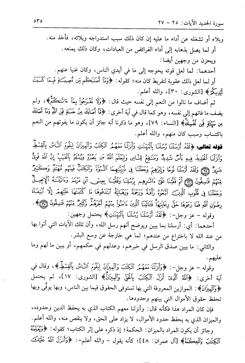 قوله تعالى: (لَقَدْ أَرْسَلْنَا رُسُلَنَا بِالْبَيِّنَاتِ وَأَنْزَلْنَا مَعَهُمُ الْكِتَابَ وَالْمِيزَانَ لِيَقُومَ النَّاسُ بِالْقِسْطِ وَأَنْزَلْنَا الْحَدِيدَ فِيهِ بَأْسٌ شَدِيدٌ وَمَنَافِعُ لِلنَّاسِ وَلِيَعْلَمَ اللَّهُ مَنْ يَنْصُرُهُ وَرُسُلَهُ بِالْغَيْبِ إِنَّ اللَّهَ قَوِيٌّ عَزِيزٌ (25) وَلَقَدْ أَرْسَلْنَا نُوحًا وَإِبْرَاهِيمَ وَجَعَلْنَا فِي ذُرِّيَّتِهِمَا النُّبُوَّةَ وَالْكِتَابَ فَمِنْهُمْ مُهْتَدٍ وَكَثِيرٌ مِنْهُمْ فَاسِقُونَ (26) ثُمَّ قَفَّيْنَا عَلَى آثَارِهِمْ بِرُسُلِنَا وَقَفَّيْنَا بِعِيسَى ابْنِ مَرْيَمَ وَآتَيْنَاهُ الْإِنْجِيلَ وَجَعَلْنَا فِي قُلُوبِ الَّذِينَ اتَّبَعُوهُ رَأْفَةً وَرَحْمَةً وَرَهْبَانِيَّةً ابْتَدَعُوهَا مَا كَتَبْنَاهَا عَلَيْهِمْ إِلَّا ابْتِغَاءَ رِضْوَانِ اللَّهِ فَمَا رَعَوْهَا حَقَّ رِعَايَتِهَا فَآتَيْنَا الَّذِينَ آمَنُوا مِنْهُمْ أَجْرَهُمْ وَكَثِيرٌ مِنْهُمْ فَاسِقُونَ (27).
