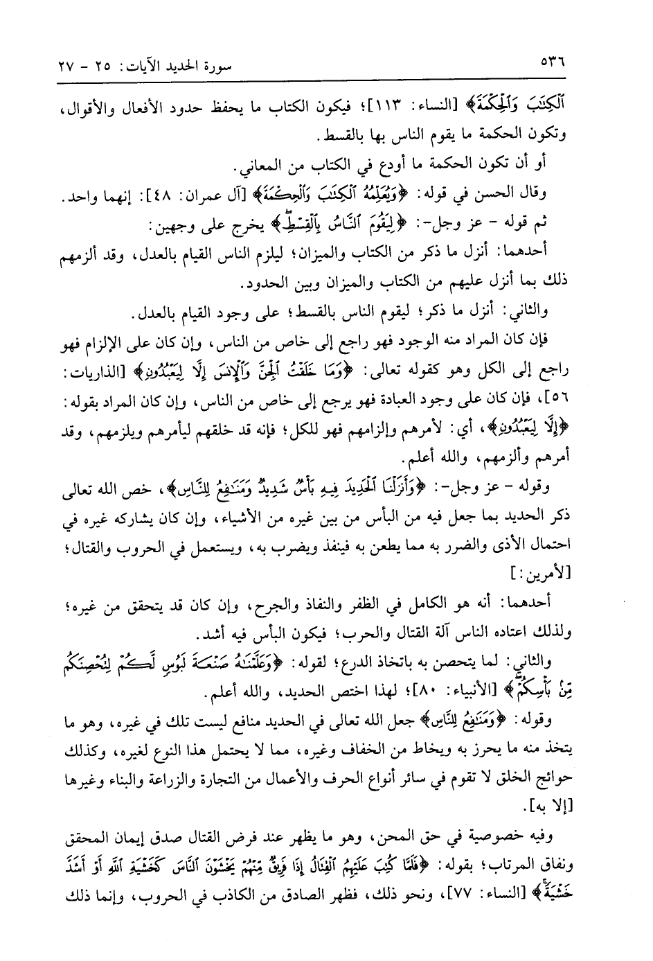 الْكِتَابَ وَالْحِكْمَةَ)؛ فيكون الكتاب ما يحفظ حدود الأفعال والأقوال، وتكون الحكمة ما يقوم الناس بها بالقسط.