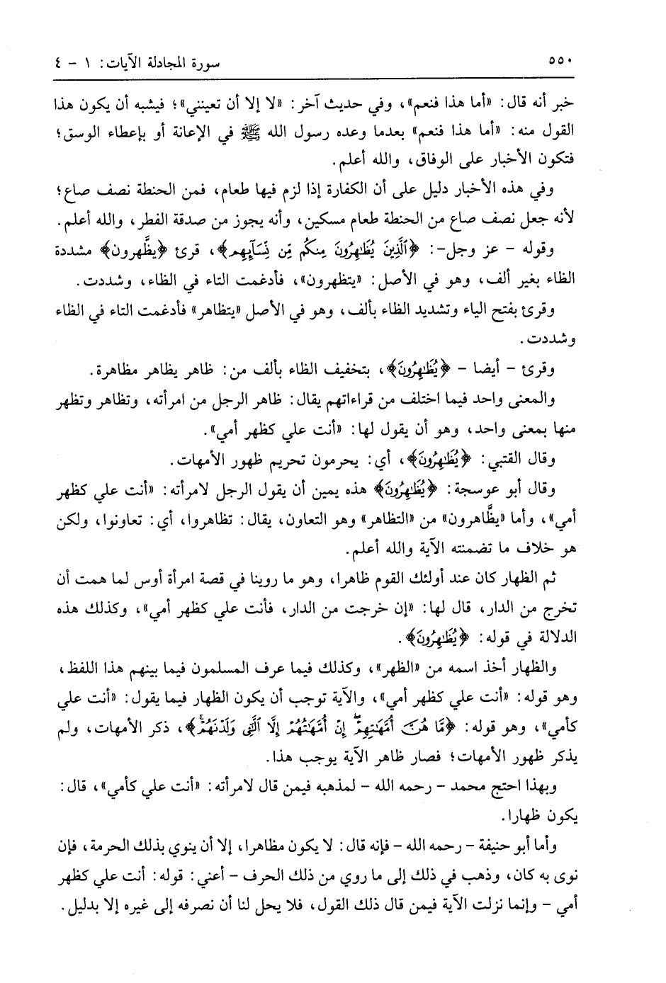 والمعنى واحد فيما اختلف من قراءاتهم يقال: ظاهر الرجل من امرأته، وتظاهر وتظهَّر منها بمعنى واحد، وهو أن يقول لها: " أنت عليَّ كظهر أمي ".