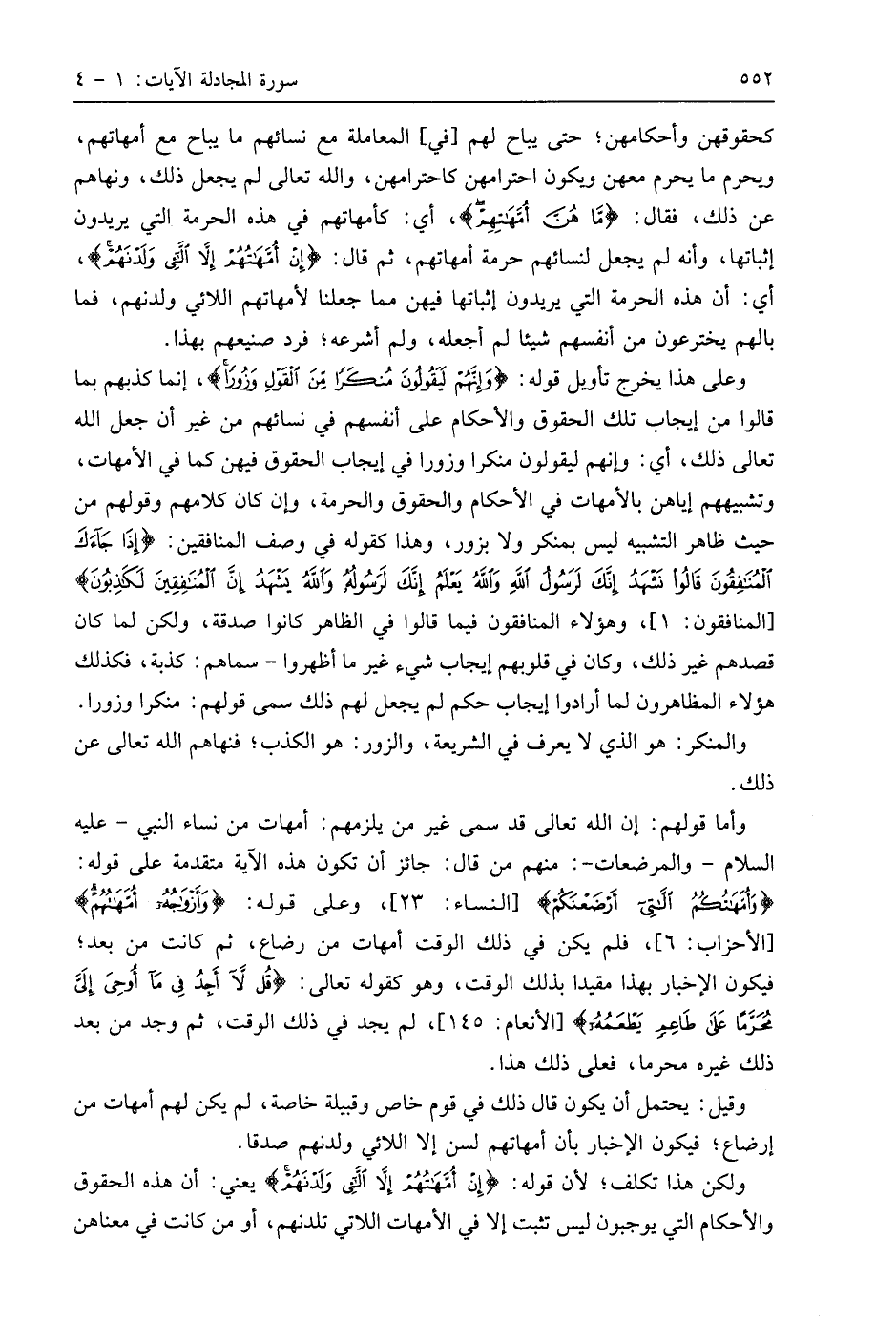 وعلى هذا يخرج تأويل قوله: (وَإِنَّهُمْ لَيَقُولُونَ مُنْكَرًا مِنَ الْقَوْلِ وَزُورًا)، إنما كذبهم بما قالوا من إيجاب تلك الحقوق والأحكام على أنفسهم في نسائهم من غير أن جعل الله تعالى ذلك، أي: وإنهم ليقولون منكرا وزورا في إيجاب الحقوق فيهن كما في الأمهات، وتشبيههم إياهن بالأمهات في الأحكام والحقوق والحرمة، وإن كان كلامهم وقولهم من حيث ظاهر التشبيه ليس بمنكر ولا بزور، وهذا كقوله في وصف المنافقين: (إِذَا جَاءَكَ الْمُنَافِقُونَ قَالُوا نَشْهَدُ إِنَّكَ لَرَسُولُ اللَّهِ وَاللَّهُ يَعْلَمُ إِنَّكَ لَرَسُولُهُ وَاللَّهُ يَشْهَدُ إِنَّ الْمُنَافِقِينَ لَكَاذِبُونَ)، وهَؤُلَاءِ المنافقون فيما قالوا في الظاهر كانوا صدقة، ولكن لما كان قصدهم غير ذلك، وكان في قلوبهم إيجاب شيء غير ما أظهروا - سماهم: كذبة، فكذلك هَؤُلَاءِ المظاهرون لما أرادوا إيجاب حكم لم يجعل لهم ذلك سمى قولهم: منكرا وزورا.