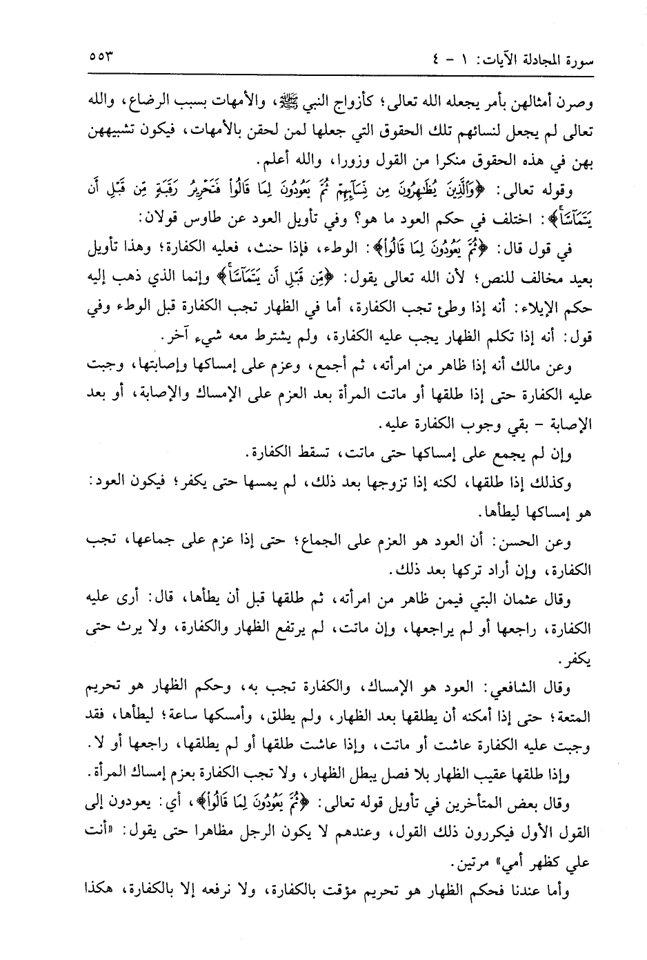 وقوله تعالى: (وَالَّذِينَ يُظَاهِرُونَ مِنْ نِسَائِهِمْ ثُمَّ يَعُودُونَ لِمَا قَالُوا فَتَحْرِيرُ رَقَبَةٍ مِنْ قَبْلِ أَنْ يَتَمَاسَّا ذَلِكُمْ تُوعَظُونَ بِهِ وَاللَّهُ بِمَا تَعْمَلُونَ خَبِيرٌ (3) اختلف في حكم العود ما هو؟ وفي تأويل العود عن طاوس قولان:
