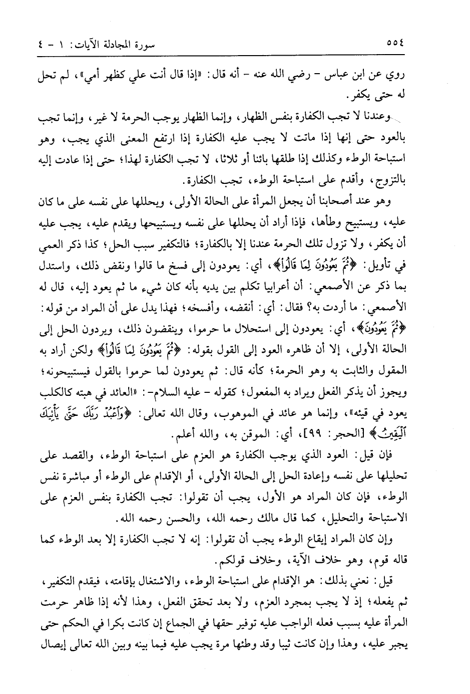 فَإِنْ قِيلَ: العود الذي يوجب الكفارة هو العزم على استباحة الوطء، والقصد على تحليلها على نفسه وإعادة الحل إلى الحالة الأولى، أو الإقدام على الوطء أو مباشرة نفس الوطء، فإن كان المراد هو الأول، يجب أن تقولوا: تجب الكفارة بنفس العزم على الاستباحة والتحليل، كما قال مالك رحمه اللَّه، والحسن رحمه اللَّه.