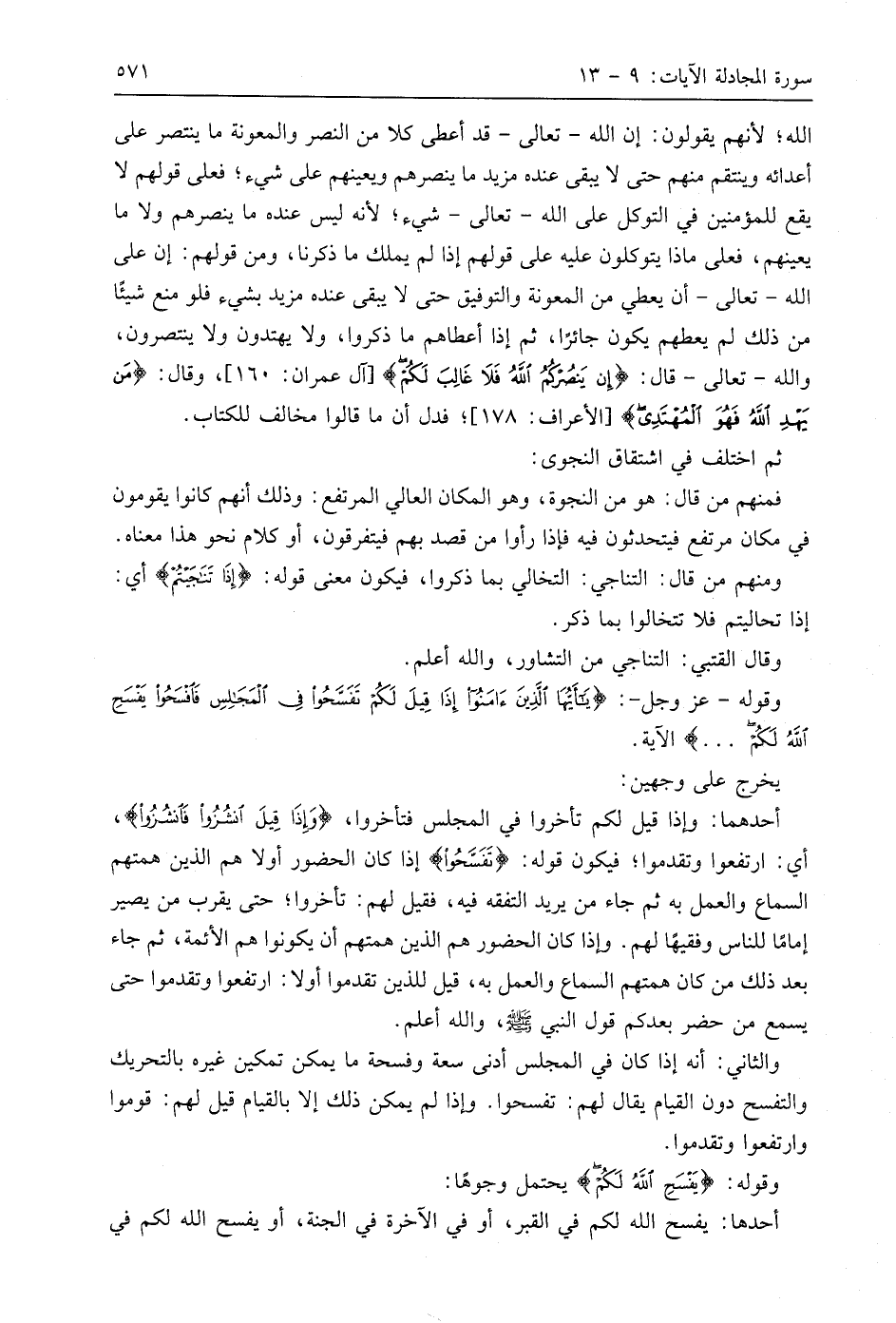 وقوله - عَزَّ وَجَلَّ -: (يَا أَيُّهَا الَّذِينَ آمَنُوا إِذَا قِيلَ لَكُمْ تَفَسَّحُوا فِي الْمَجَالِسِ فَافْسَحُوا يَفْسَحِ اللَّهُ لَكُمْ وَإِذَا قِيلَ انْشُزُوا فَانْشُزُوا يَرْفَعِ اللَّهُ الَّذِينَ آمَنُوا مِنْكُمْ وَالَّذِينَ أُوتُوا الْعِلْمَ دَرَجَاتٍ وَاللَّهُ بِمَا تَعْمَلُونَ خَبِيرٌ (11).