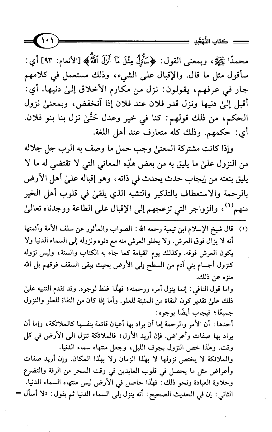 (¬1) قال شيخ الإسلام ابن تيمية رحمه الله: الصواب والمأثور عن سلف الأمة وأئمتها أنه لا يزال فوق العرش. ولا يخلو العرش منه مع دنوه ونزوله إلى السماء الدنيا ولا يكون العرش فوقه. وكذلك يوم القيامة كما جاء به الكتاب والسنة، وليس نزوله كنزول أجسام بني آدم من السطح إلى الأرض بحيث يبقى السقف فوقهم بل الله منزه عن ذلك.