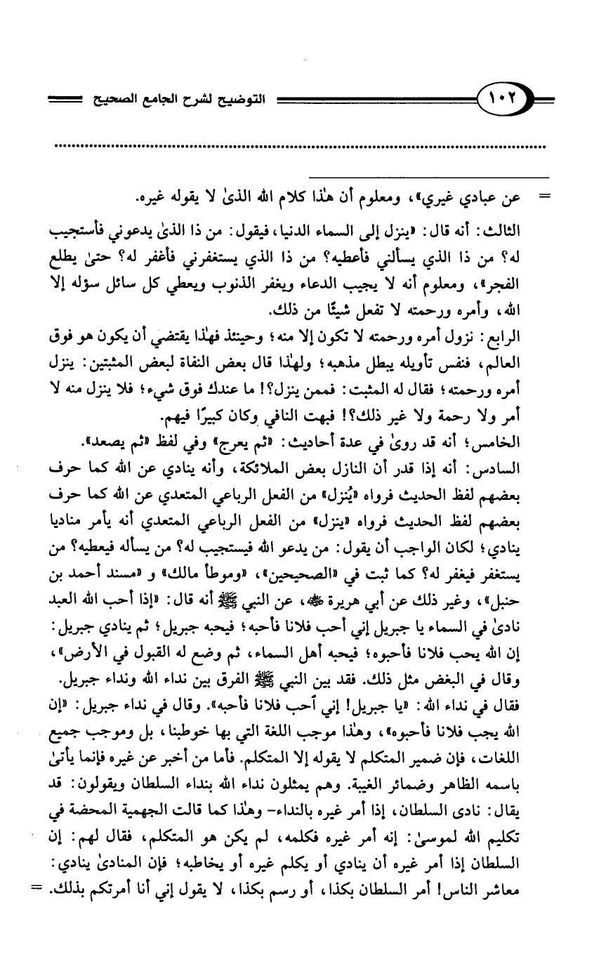 السادس: أنه إذا قدر أن النازل بعض الملائكة، وأنه ينادي عن الله كما حرف بعضهم لفظ الحديث فرواه "يُنزل" من الفعل الرباعي المتعدي عن الله كما حرف بعضهم لفظ الحديث فرواه "ينزل" من الفعل الرباعي المتعدي أنه يأمر مناديا ينادي؛ لكان الواجب أن يقول: من يدعو الله فيستجيب له؟ من يسأله فيعطيه؟ من يستغفر فيغفر له؟ كما ثبت في "الصحيحين"، "وموطأ مالك" و"مسند أحمد بن حنبل"، وغير ذلك عن أبي هريرة - رضي الله عنه -، عن النبي - صلى الله عليه وسلم - أنه قال: وإذا أحب الله العبد نادى في السماء يا جبريل إني أحب فلانا فأحبه؛ فيحبه جبريل؛ ثم ينادي جبريل: إن الله يحب فلانا فأحبوه؛ فيحبه أهل السماء، ثم وضع له القبول في الأرض"، وقال في البغض مثل ذلك. فقد بين النبي - صلى الله عليه وسلم - الفرق بين نداء الله ونداء جبريل. فقال في نداء الله: "يا جبريل! إني احب فلانا فأحبه". وقال في نداء جبريل: "إن الله يحب فلانا فأحبوه"، وهذا موجب اللغة التي بها خوطبنا، بل وموجب جميع اللغات، فإن ضمير المتكلم لا يقوله إلا المتكلم. فأما من أخبر عن غيره فإنما يأتى باسمه الظاهر وضمائر الغيبة. وهم يمثلون نداء الله بنداء السلطان ويقولون: قد يقال: نادى السلطان، إذا أمر غيره بالنداء -وهذا كما قالت الجهمية المحضة في تكليم الله لموسى: إنه أمر غيره فكلمه، لم يكن هو المتكلم، فقال لهم: إن السلطان إذا أمر غيره أن ينادي أو يكلم غيره أو يخاطبه؛ فإن المنادى ينادي: معاشر الناس! أمر السلطان بكذا، أو رسم بكذا، لا يقول إني أنا أمرتكم بذلك. =