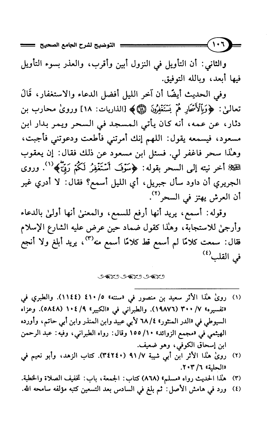 وفي الحديث أيضًا أن آخر الليل أفضل الدعاء والاستغفار، قَالَ تعالى: {وَبِالأَسْحَارِ هُمْ يَسْتَغْفِرُونَ (18)} [الذاريات: 18] وروى محارب بن دثار، عن عمه، أنه كان يأتي المسجد في السحر ويمر بدار ابن مسعود، فيسمعه يقول: اللهم إنك أمرتني فأطعت ودعوتني فأجبت، وهذا سحر فاغفر لي. فسئل ابن مسعود عن ذلك فقال: إن يعقوب - عليه السلام - أخر نيته إلى السحر بقوله: {سَوْفَ أَسْتَغْفِرُ لَكُمْ رَبِّي} (¬1). وروى الجريري أن داود سأل جبريل، أي الليل أسمع؟ فقال: لا أدري غير أن العرش يهتز في السحر (¬2).