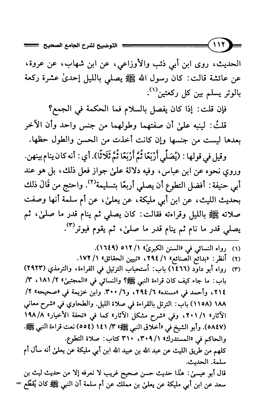 الحديث، روى ابن أبي ذئب والأوزاعي، عن ابن شهاب، عن عروة، عن عائشة قالت: كان رسول الله - صلى الله عليه وسلم - يصلي بالليل إحدى عشرة ركعة بالوتر يسلم بين كل ركعتين (¬1).