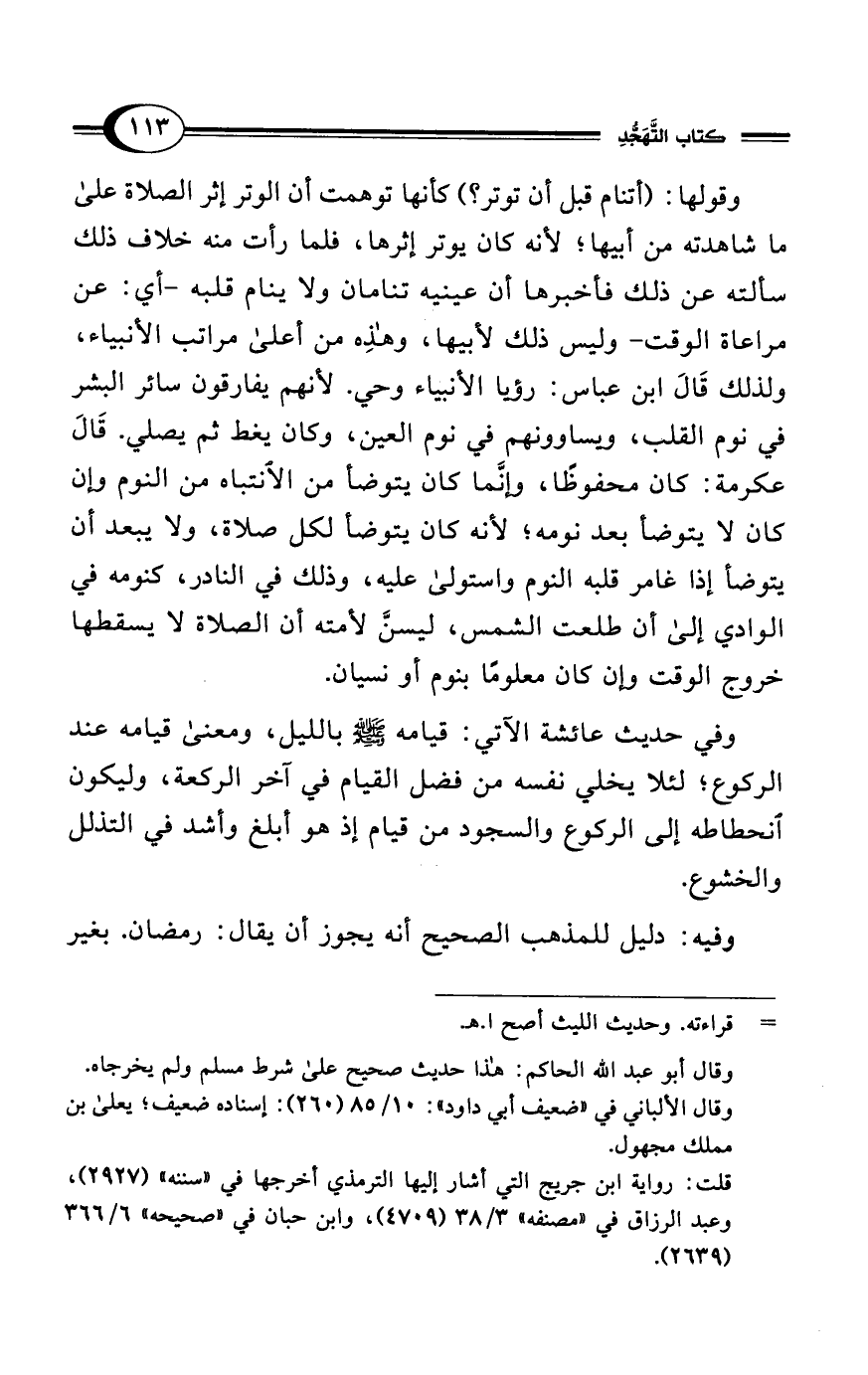وقولها: (أتنام قبل أن توتر؟) كأنها توهمت أن الوتر إثر الصلاة على ما شاهدته من أبيها؛ لأنه كان يوتر إثرها، فلما رأت منه خلاف ذلك سألته عن ذلك فأخبرها أن عينيه تنامان ولا ينام قلبه -أي: عن مراعاة الوقت- وليس ذلك لأبيها، وهذِه من أعلى مراتب الأنبياء، ولذلك قَالَ ابن عباس: رؤيا الأنبياء وحي. لأنهم يفارقون سائر البشر في نوم القلب، ويساوونهم في نوم العين، وكان يغط ثم يصلي. قَالَ عكرمة: كان محفوظًا، وإنَّما كان يتوضأ من الانتباه من النوم وإن كان لا يتوضأ بعد نومه؛ لأنه كان يتوضأ لكل صلاة، ولا يبعد أن يتوضأ إذا غامر قلبه النوم واستولى عليه، وذلك في النادر، كنومه في الوادي إلى أن طلعت الشمس، ليسنَّ لأمته أن الصلاة لا يسقطها خروج الوقت وإن كان معلومًا بنوم أو نسيان.