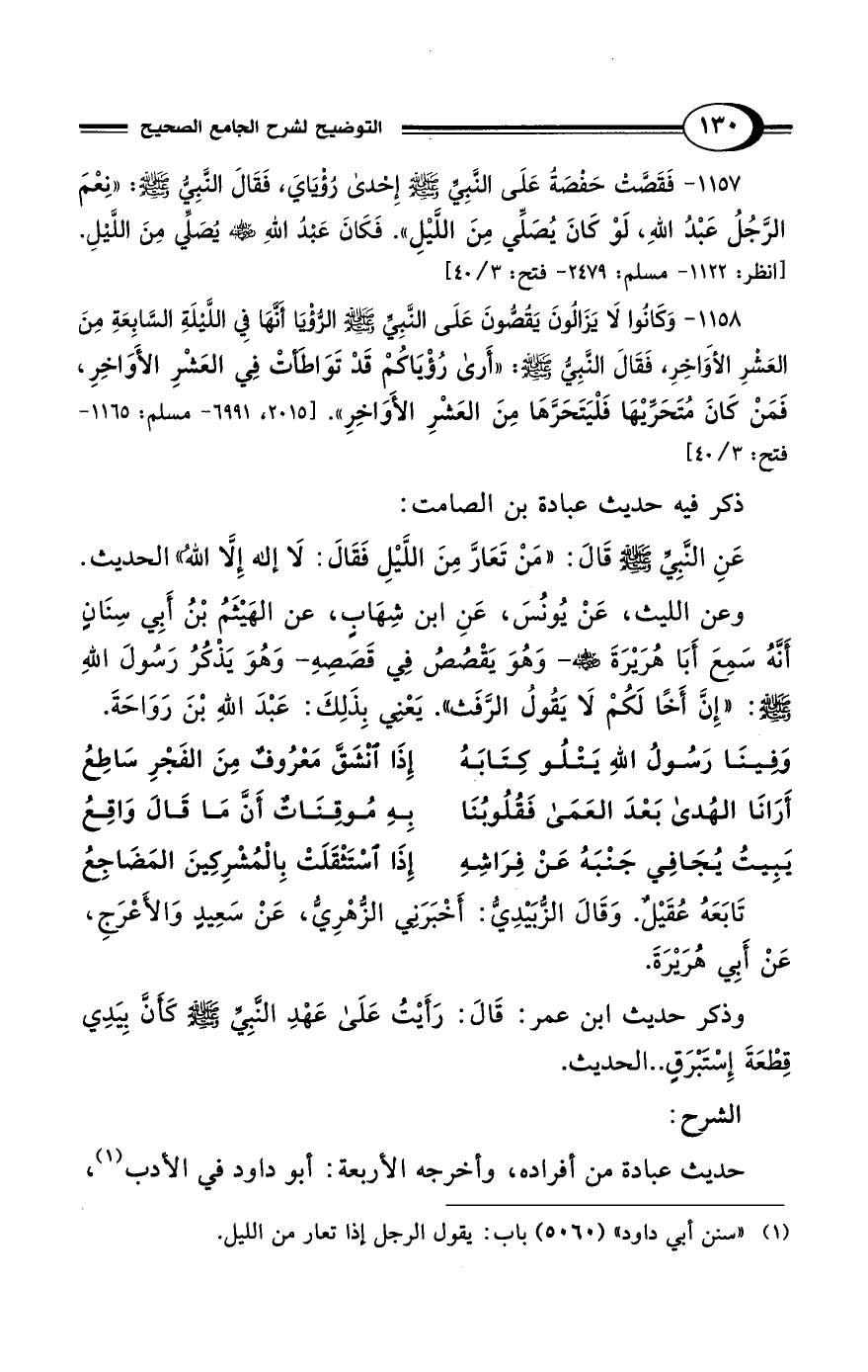 1158 - وَكَانُوا لاَ يَزَالُونَ يَقُصُّونَ عَلَى النَّبِيِّ - صلى الله عليه وسلم - الرُّؤْيَا أَنَّهَا فِي اللَّيْلَةِ السَّابِعَةِ مِنَ العَشْرِ الأَوَاخِرِ، فَقَالَ النَّبِيُّ - صلى الله عليه وسلم -: "أَرَى رُؤْيَاكُمْ قَدْ تَوَاطَتْ فِي العَشْرِ الأَوَاخِرِ، فَمَنْ كَانَ مُتَحَرِّيْهَا فَلْيَتَحَرَّهَا مِنَ العَشْرِ الأَوَاخِرِ". [2015، 6991 - مسلم: 1165 - فتح: 3/ 40]