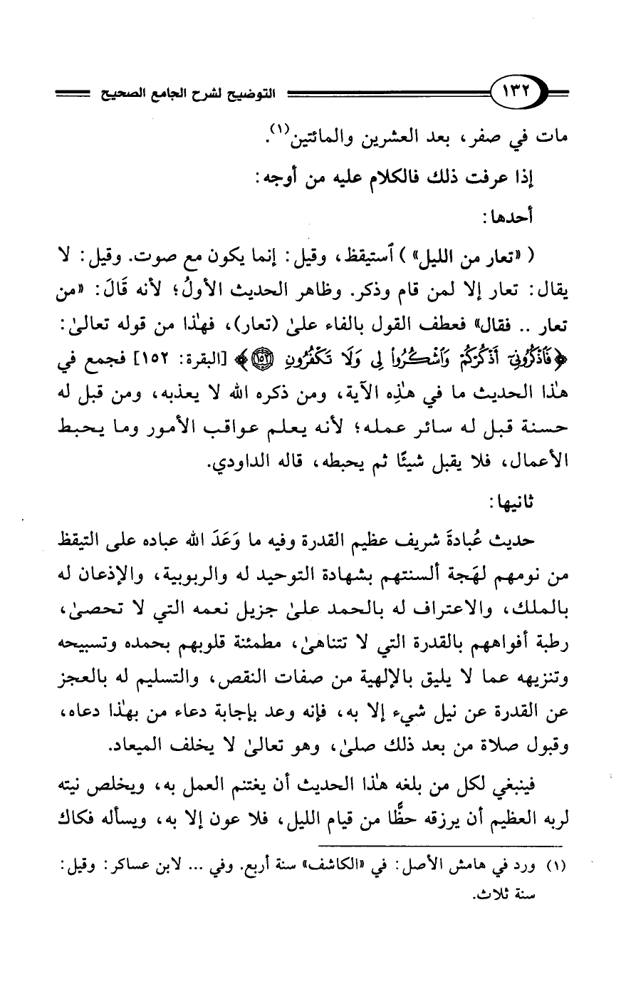 ("تعار من الليل") استيقظ، وقيل: إنما يكون مع صوت. وقيل: لا يقال: تعار إلا لمن قام وذكر. وظاهر الحديث الأولُ؛ لأنه قَالَ: "من تعار .. فقال" فعطف القول بالفاء على (تعار)، فهذا من قوله تعالى: {فَاذْكُرُونِي أَذْكُرْكُمْ وَاشْكُرُوا لِي وَلَا تَكْفُرُونِ (152)} [البقرة: - 152] فجمع في هذا الحديث ما في هذِه الآية، ومن ذكره الله لا يعذبه، ومن قبل له حسنة قبل له سائر عمله؛ لأنه يعلم عواقب الأمور وما يحبط الأعمال، فلا يقبل شيئًا ثم يحبطه، قاله الداودي.