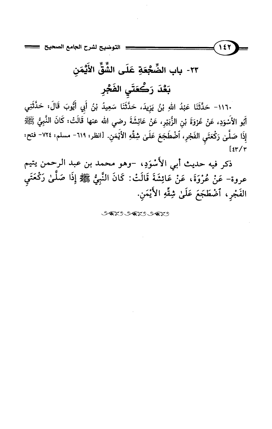 1160 - حَدَّثَنَا عَبْدُ اللهِ بْنُ يَزِيدَ، حَدَّثَنَا سَعِيدُ بْنُ أَبِي أَيُّوبَ قَالَ: حَدَّثَنِي أَبُو الأَسْوَدِ، عَنْ عُرْوَةَ بْنِ الزُّبَيْرِ عَنْ عَائِشَةَ رضي الله عنها قَالَتْ: كَانَ النَّبِيُّ - صلى الله عليه وسلم - إِذَا صَلَّى رَكْعَتَىِ الفَجْرِ، اضْطَجَعَ عَلَى شِقِّهِ الأَيْمَنِ. [انظر: 619 - مسلم: 724 - فتح: 3/ 43]
