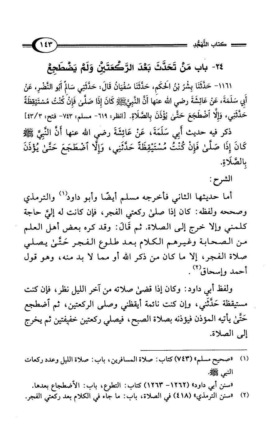 1161 - حَدَّثَنَا بِشْرُ بْنُ الحَكَمِ، حَدَّثَنَا سُفْيَانُ قَالَ: حَدَّثَنِي سَالِمٌ أَبُو النَّضْرِ، عَنْ أَبِي سَلَمَةَ عَنْ عَائِشَةَ رضي الله عنها أَنَّ النَّبِيَّ - صلى الله عليه وسلم - كَانَ إِذَا صَلَّى فَإِنْ كُنْتُ مُسْتَيْقِظَةً حَدَّثَنِي، وَإِلاَّ اضْطَجَعَ حَتَّى يُؤْذَنَ بِالصَّلاَةِ. [انظر: 619 - مسلم: 743 - فتح: 3/ 43]