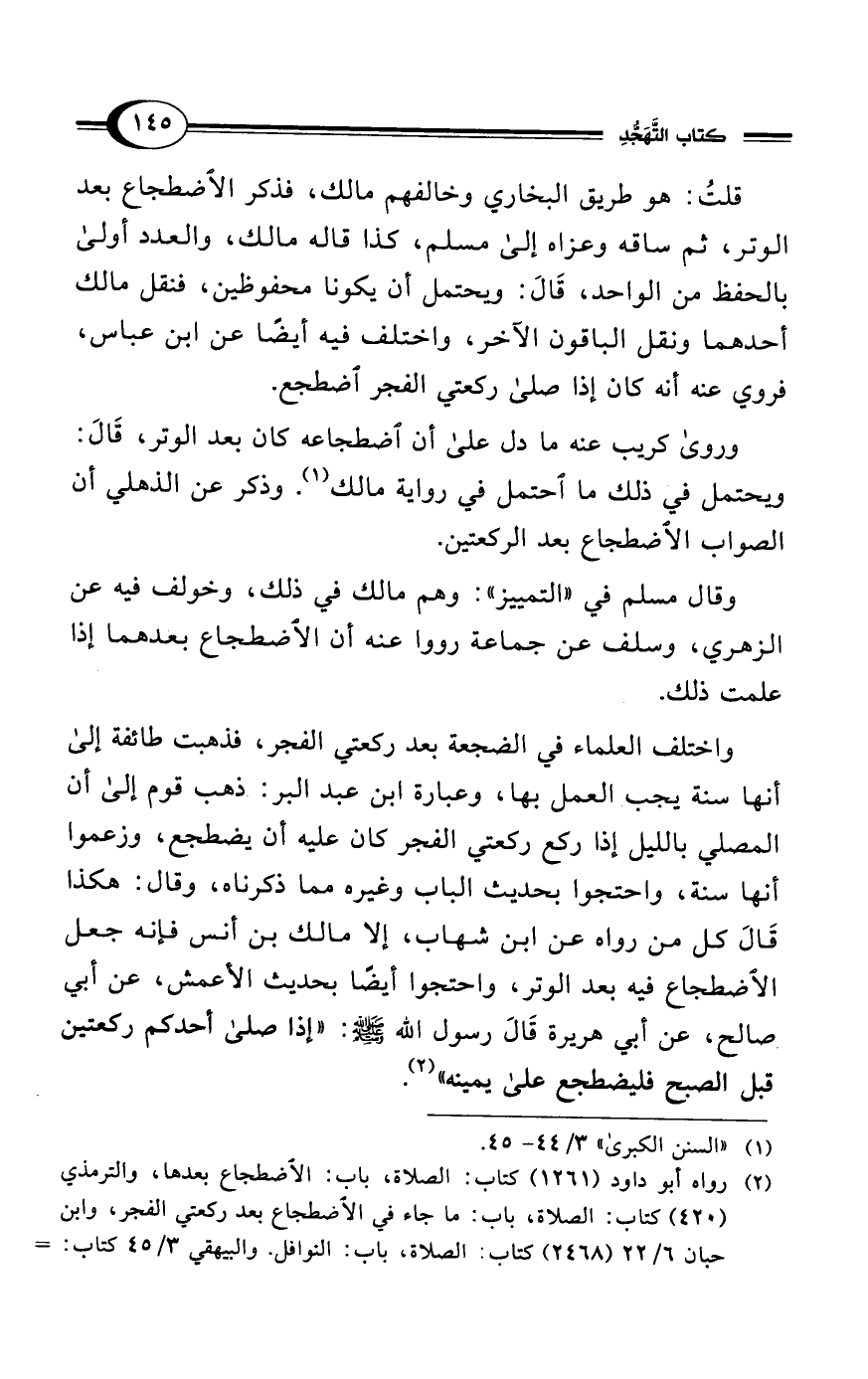 (¬2) رواه أبو داود (1261) كتاب: الصلاة، باب: الاضطجاع بعدها، والترمذي (420) كتاب: الصلاة، باب: ما جاء في الاضطجاع بعد ركعتي الفجر، وابن حبان 6/ 22 (2468) كتاب: الصلاة، باب: النوافل. والبيهقي 3/ 45 كتاب: =