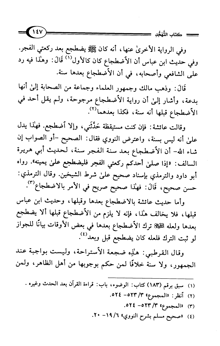 وقال القرطبي: هذِه ضجعة الاستراحة، وليست بواجبة عند الجمهور، ولا سنة خلافًا لمن حكم بوجوبها من أهل الظاهر، ولمن