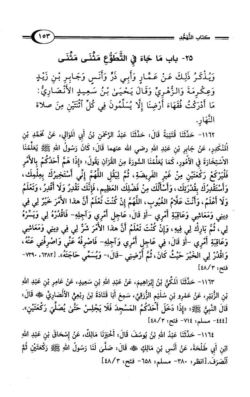 1162 - حَدَّثَنَا قُتَيْبَةُ قَالَ: حَدَّثَنَا عَبْدُ الرَّحْمَنِ بْنُ أَبِي المَوَالِي، عَنْ مُحَمَّدِ بْنِ المُنْكَدِرِ، عَنْ جَابِرِ بْنِ عَبْدِ اللهِ رضي الله عنهما قَالَ: كَانَ رَسُولُ اللهِ - صلى الله عليه وسلم - يُعَلِّمُنَا الاِسْتِخَارَةَ فِي الأُمُورِ، كَمَا يُعَلِّمُنَا السُّورَةَ مِنَ القُرْآنِ يَقُولُ: "إِذَا هَمَّ أَحَدُكُمْ بِالأَمْرِ فَلْيَرْكَعْ رَكْعَتَيْنِ مِنْ غَيْرِ الفَرِيضَةِ، ثُمَّ لِيَقُلِ اللَّهُمَّ إِنِّي أَسْتَخِيرُكَ بِعِلْمِكَ، وَأَسْتَقْدِرُكَ بِقُدْرَتِكَ، وَأَسْأَلُكَ مِنْ فَضْلِكَ العَظِيمِ، فَإِنَّكَ تَقْدِرُ وَلاَ أَقْدِرُ، وَتَعْلَمُ وَلاَ أَعْلَمُ، وَأَنْتَ عَلاَّمُ الغُيُوبِ، اللَّهُمَّ إِنْ كُنْتَ تَعْلَمُ أَنَّ هَذَا الأَمْرَ خَيْرٌ لِي فِي دِينِي وَمَعَاشِي وَعَاقِبَةِ أَمْرِي -أَوْ قَالَ: عَاجِلِ أَمْرِي وَآجِلِهِ- فَاقْدُرْهُ لِي وَيَسِّرْهُ لِي ثُمَّ بَارِكْ لِي فِيهِ، وَإِنْ كُنْتَ تَعْلَمُ أَنَّ هَذَا الأَمْرَ شَرٌّ لِي فِي دِينِي وَمَعَاشِي وَعَاقِبَةِ أَمْرِي -أَوْ قَالَ: فِي عَاجِلِ أَمْرِي وَآجِلِهِ- فَاصْرِفْهُ عَنِّي وَاصْرِفْنِي عَنْهُ، وَاقْدُرْ لِي الخَيْرَ حَيْثُ كَانَ ثُمَّ أَرْضِنِي -قَالَ: - وَيُسَمِّي حَاجَتَهُ". [6382، 7390 - فتح: 3/ 48]