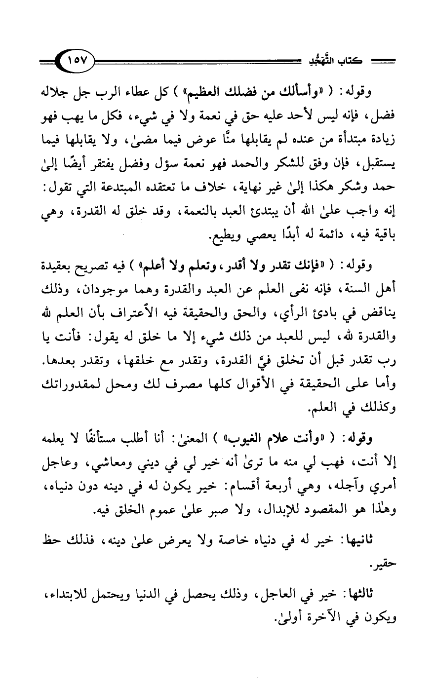 وقوله: ("فإنك تقدر ولا أقدر، وتعلم ولا أعلم") فيه تصريح بعقيدة أهل السنة، فإنه نفي العلم عن العبد والقدرة وهما موجودان، وذلك يناقض في بادئ الرأي، والحق والحقيقة فيه الاعتراف بأن العلم لله والقدرة لله، ليس للعبد من ذلك شيء إلا ما خلق له يقول: فأنت يا رب تقدر قبل أن تخلق فيَّ القدرة، وتقدر مع خلقها، وتقدر بعدها. وأما على الحقيقة في الأقوال كلها مصرف لك ومحل لمقدوراتك وكذلك في العلم.