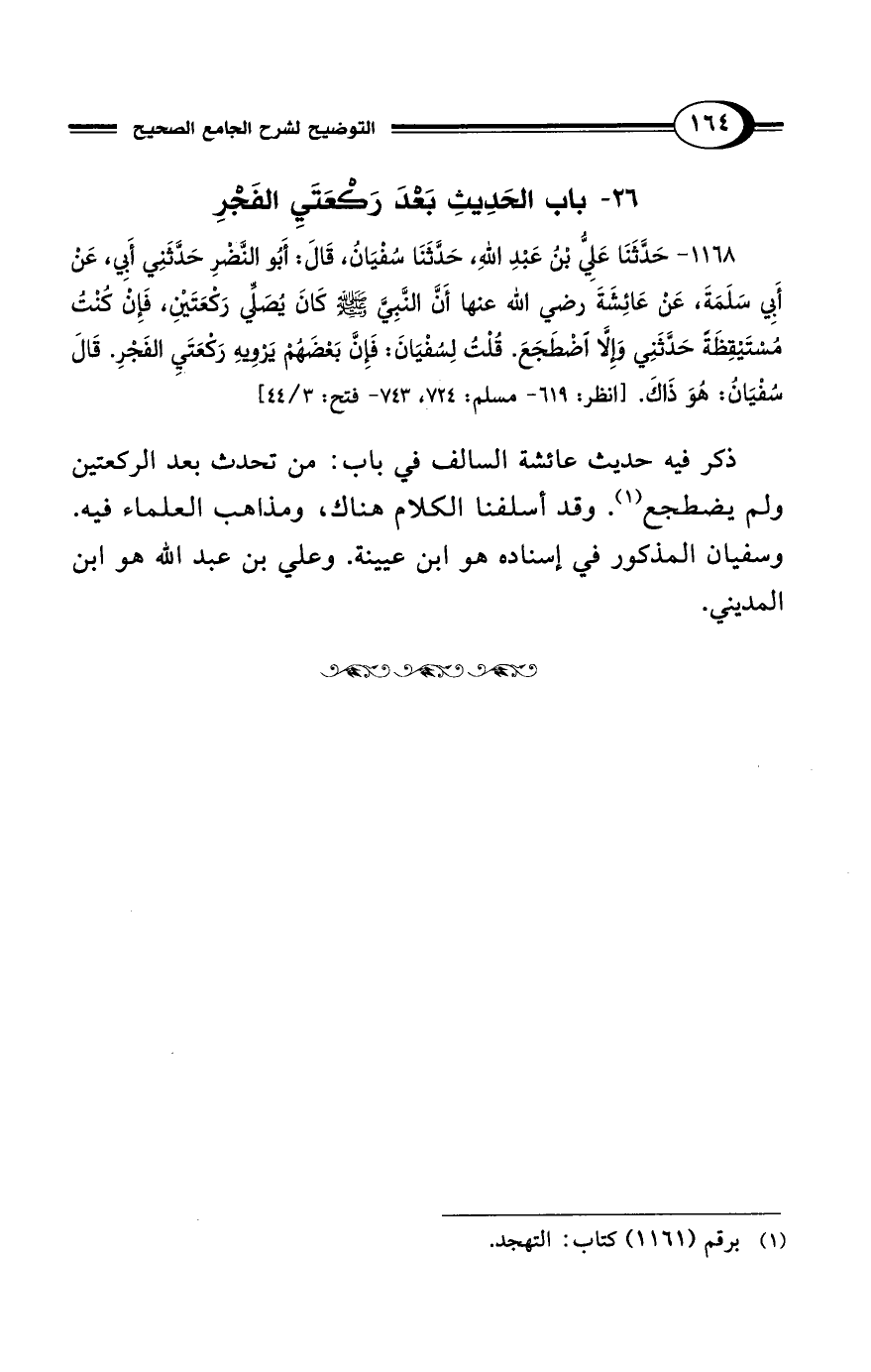 1168 - حَدَّثَنَا عَلِيُّ بْنُ عَبْدِ اللهِ، حَدَّثَنَا سُفْيَانُ، قَالَ: أَبُو النَّضْرِ حدَّثنِي أبي، عَنْ أَبِي سَلَمَةَ عَنْ عَائِشَةَ رضي الله عنها أَنَّ النَّبِيَّ - صلى الله عليه وسلم - كَانَ يُصَلِّي رَكْعَتَيْنِ، فَإِنْ كُنْتُ مُسْتَيْقِظَةً حَدَّثَنِي وَإِلاَّ اضْطَجَعَ. قُلْتُ لِسُفْيَانَ: فَإِنَّ بَعْضَهُمْ يَرْوِيهِ رَكْعَتَيِ الفَجْرِ. قَالَ سُفْيَانُ: هُوَ ذَاكَ. [انظر: 619 - مسلم: 724، 743 - فتح: 3/ 44]