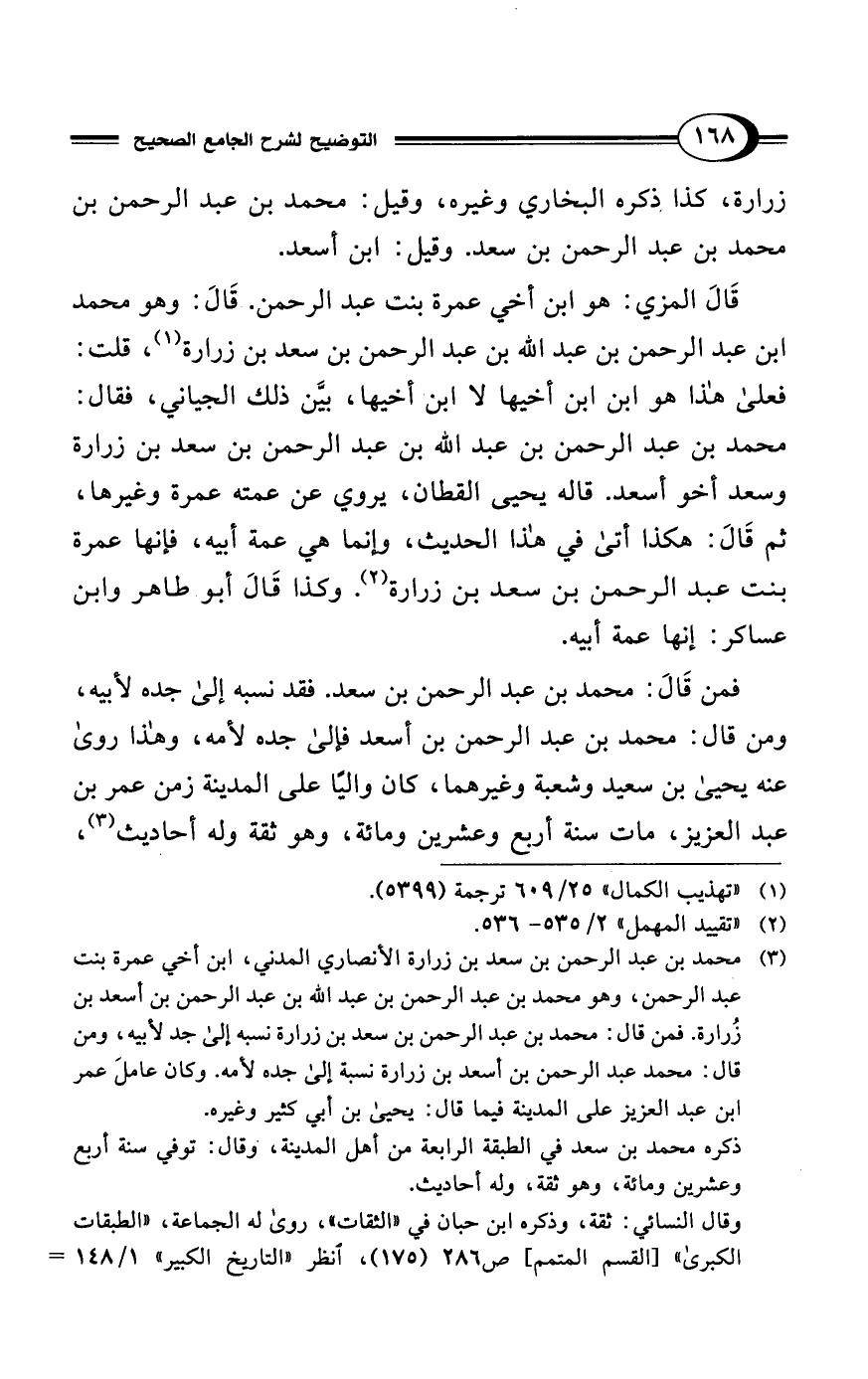 (¬3) محمد بن عبد الرحمن بن سعد بن زرارة الأنصاري المدني، ابن أخي عمرة بنت عبد الرحمن، وهو محمد بن عبد الرحمن بن عبد الله بن عبد الرحمن بن أسعد بن زُرارة. فمن قال: محمد بن عبد الرحمن بن سعد بن زرارة نسبه إلى جد لأبيه، ومن قال: محمد عبد الرحمن بن أسعد بن زرارة نسبة إلى جده لأمه. وكان عاملَ عمر ابن عبد العزيز على المدينة فيما قال: يحيى بن أبي كثير وغيره.