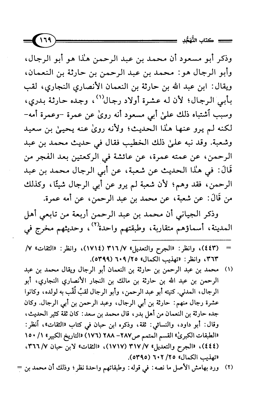 (¬1) محمد بن عبد الرحمن بن حارثة بن النعمان أبو الرجال ويقال محمد بن عبد الرحمن بن عبد الله بن حارثة بن مالك بن النجار الأنصاري النجاري، أبو الرجال، المدني. كنيته أبو عبد الرحمن، وأبو الرجال لقبُ لُقّب به لولده، وكانوا عشرة رجال منهم: حارثة بن أبي الرجال، وعبد الرحمن بن أبي الرجال. وكان جده حارثة بن النعمان من أهل بدر، قال محمد بن سعد: كان ثقة كثير الحديث، وقال: أبو داود، والنسائي: ثقة، وذكره ابن حبان في كتاب "الثقات"، انظر: "الطبقات الكبرى" القسم المتمم ص 287 - 288 (176) "التاريخ الكبير" 1/ 150 (444)، "الجرح والتعديل" 7/ 317 (1717)، "الثقات" لابن حبان 7/ 366، "تهذيب الكمال" 25/ 602 (5395).