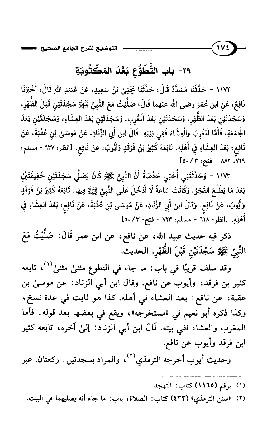 1172 - حَدَّثَنَا مُسَدَّدٌ قَالَ: حَدَّثَنَا يَحْيَى بْنُ سَعِيدٍ، عَنْ عُبَيْدِ اللهِ قَالَ: أَخْبَرَنَا نَافِعٌ عَنِ ابْنِ عُمَرَ رضي الله عنهما قَالَ: صَلَّيْتُ مَعَ النَّبِيِّ - صلى الله عليه وسلم - سَجْدَتَيْنِ قَبْلَ الظُّهْرِ، وَسَجْدَتَيْنِ بَعْدَ الظُّهْرِ، وَسَجْدَتَيْنِ بَعْدَ المَغْرِبِ، وَسَجْدَتَيْنِ بَعْدَ العِشَاءِ، وَسَجْدَتَيْنِ بَعْدَ الجُمُعَةِ، فَأَمَّا المَغْرِبُ وَالعِشَاءُ فَفِي بَيْتِهِ. قَالَ ابْنُ أَبِي الزِّنَادِ، عَنْ مُوسَى بْنِ عُقْبَةَ، عَنْ نَافِعٍ: بَعْدَ العِشَاءِ فِي أَهْلِهِ. تَابَعَهُ كَثِيرُ بْنُ فَرْقَدٍ وَأَيُّوبُ عَنْ نَافِعٍ. [انظر: 937 - مسلم: 729، 882 - فتح: 3/ 50]