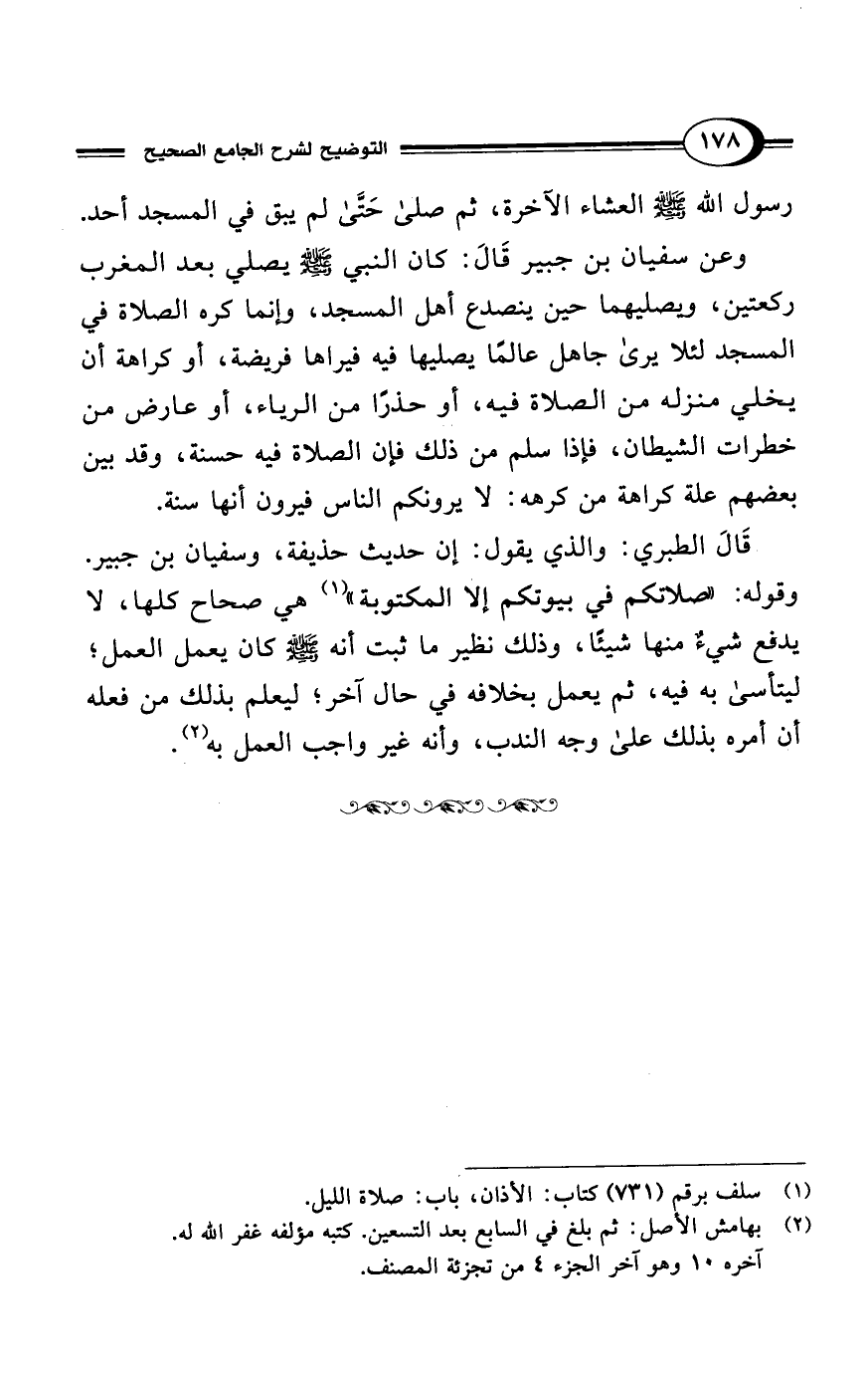 وعن سفيان بن جبير قَالَ: كان النبي - صلى الله عليه وسلم - يصلي بعد المغرب ركعتين، ويصليهما حين ينصدع أهل المسجد، وإنما كره الصلاة في المسجد لئلا يرى جاهل عالمًا يصليها فيه فيراها فريضة، أو كراهة أن يخلي منزله من الصلاة فيه، أو حذرًا من الرياء، أو عارض من خطرات الشيطان، فإذا سلم من ذلك فإن الصلاة فيه حسنة، وقد بين بعضهم علة كراهة من كرهه: لا يرونكم الناس فيرون أنها سنة.